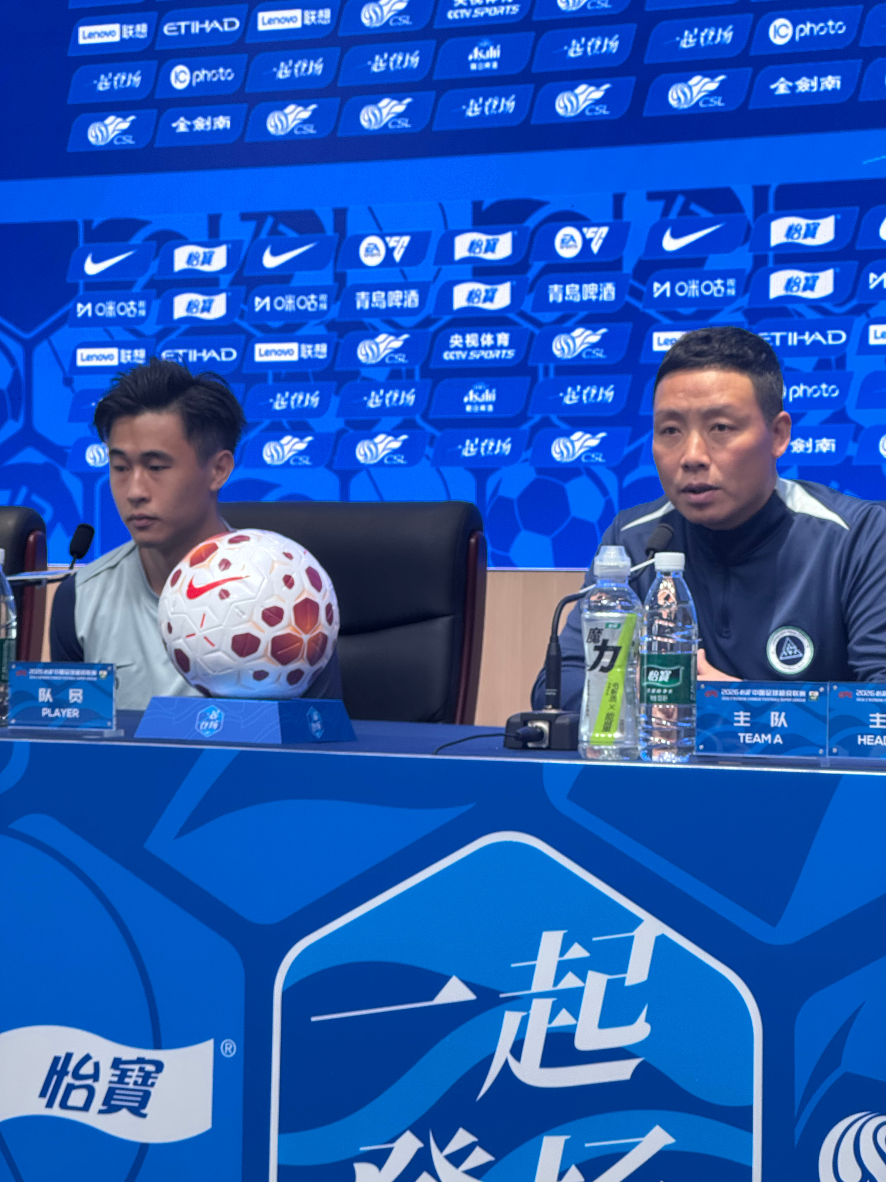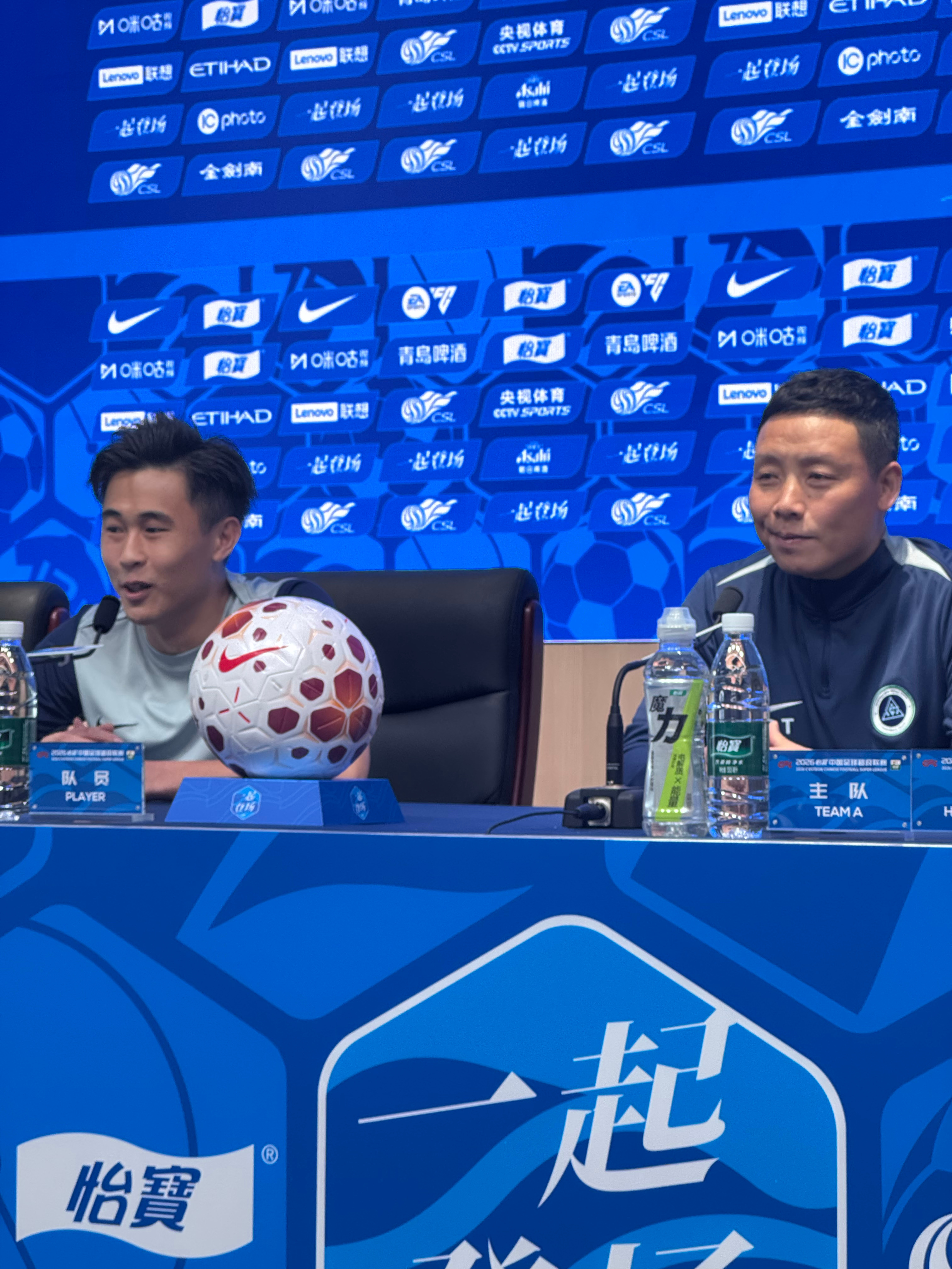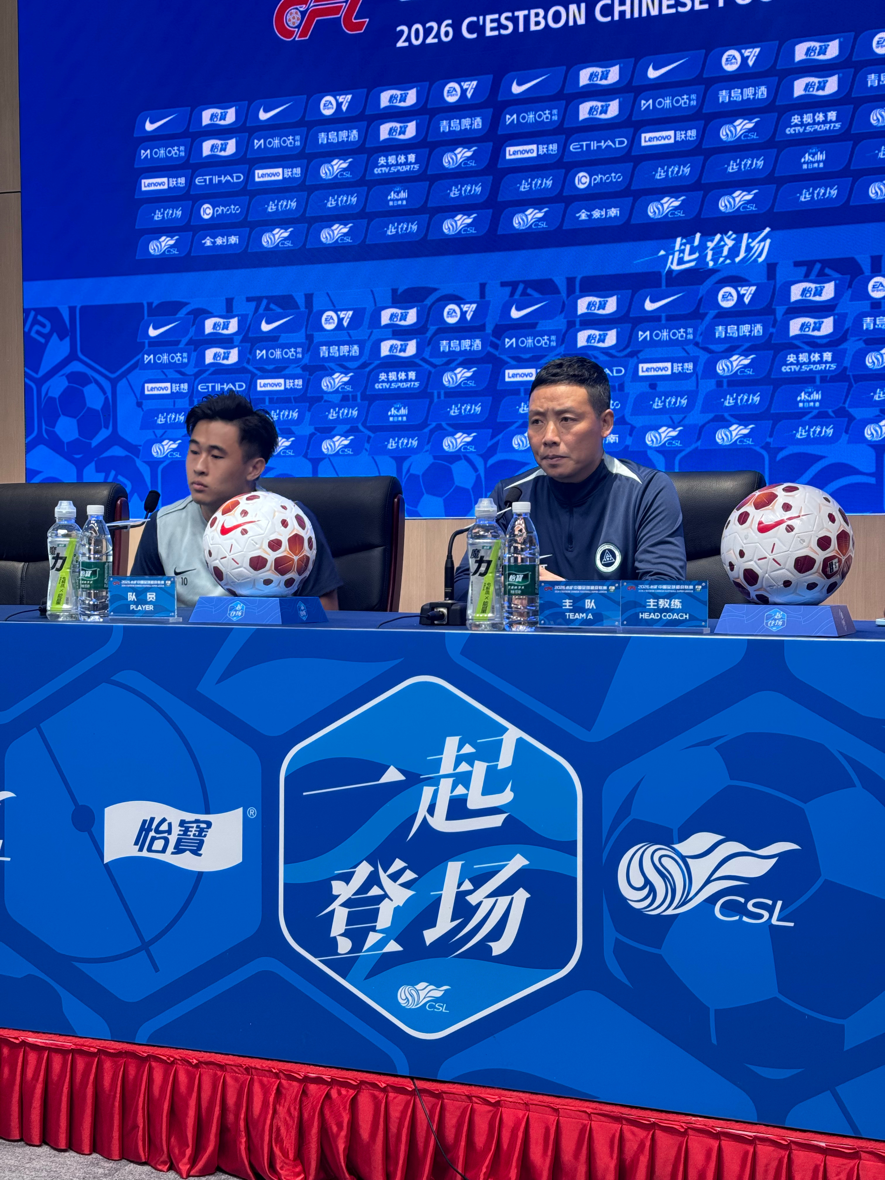 深圳新鹏城 主队赛前发布会正在进行中,主教练陈涛携队员戴伟浚出席。 中超联赛 我
