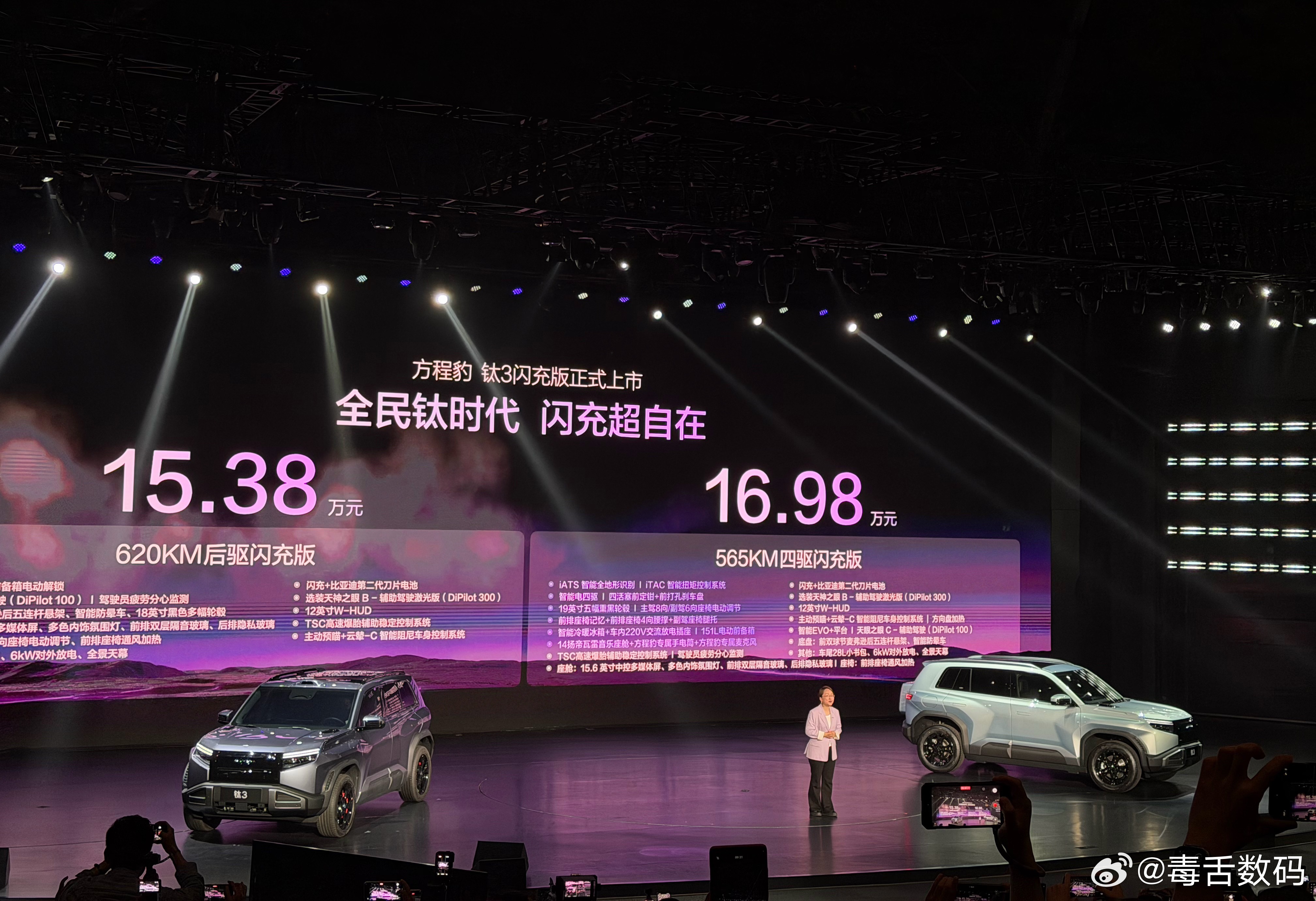 比亚迪方程豹钛3闪充版正式发布,搭载比亚迪第二代刀片电池,新车提供 620KM后驱版和 565KM四驱版两种版本,全系标配比亚迪闪充技术、还有智能 EVO+ 平台、天神之眼辅助驾驶系统等。15.38万起,还可享受1年半的免费闪充权益 深圳·六角大楼