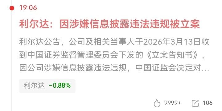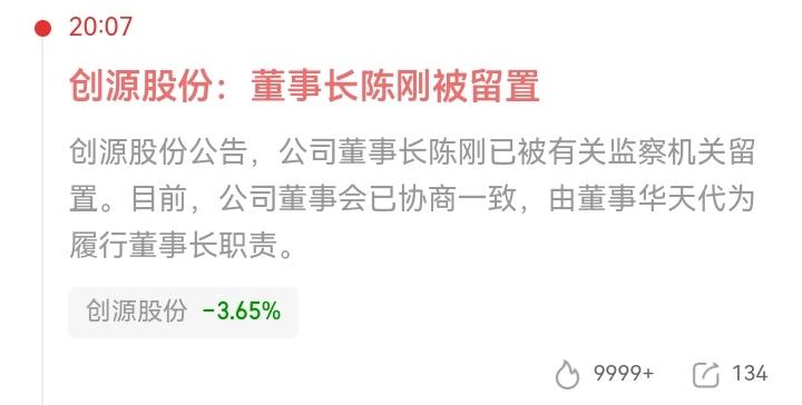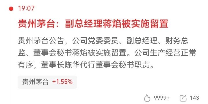 天雷滚滚,四家公司突发利空,下周一股价如何反应?有持仓的散户瑟瑟发抖呀,周末没法愉快的玩耍了。 1. 创源股份:董事长陈刚被留置 2. 双良节能:控股股东双良集团因涉嫌信息披露违法违规被立案 3. 贵州茅台:副总经理蒋焰被实施留置 4. 利尔达:因涉嫌信息披露违法违规被立案 上面的打击力度越来越强了,有一个查一个,绝不姑息,真要点个大大的赞呀。话说回来,股价要是大跌,散户就得买单,太不公平了。以后选股,可得擦亮眼睛。