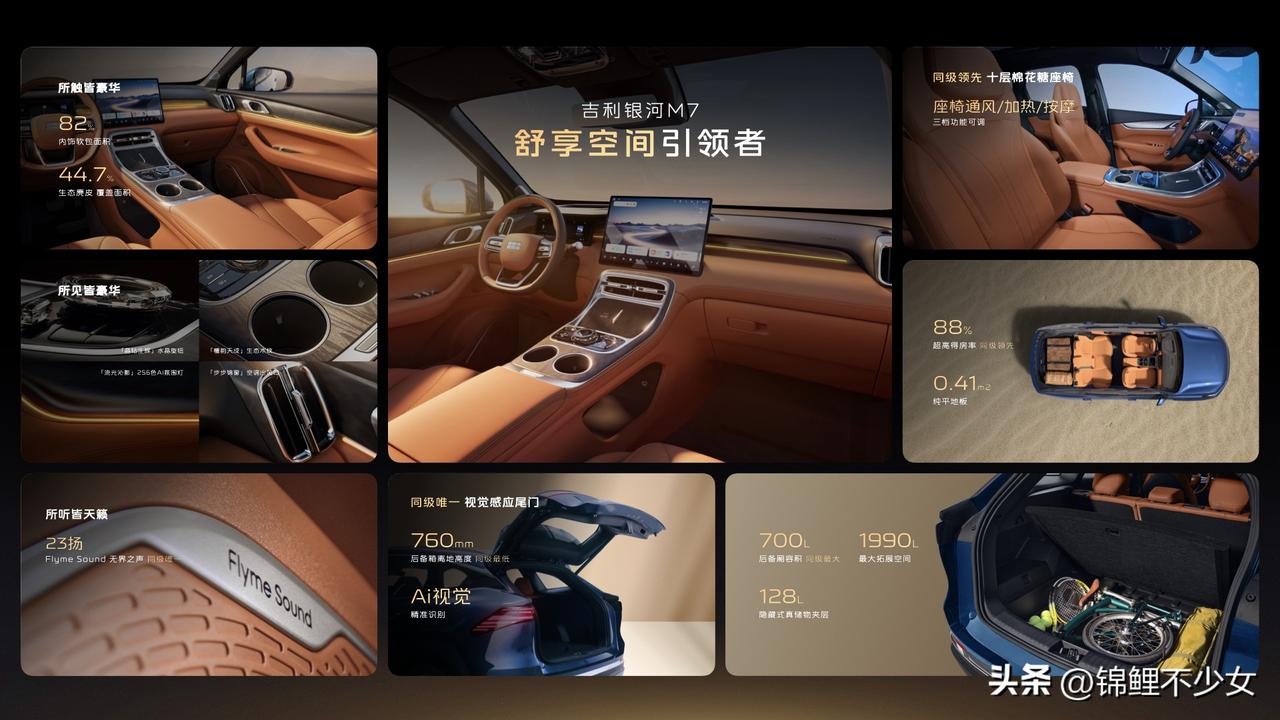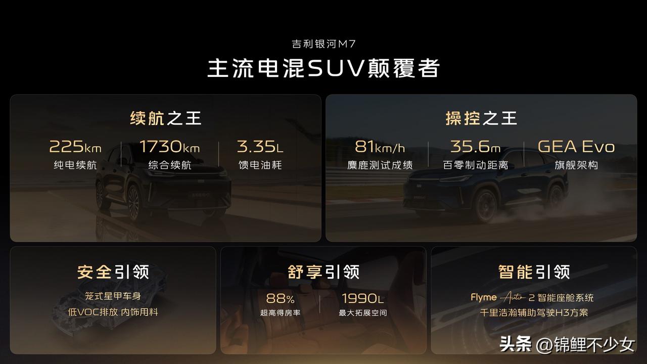 吉利银河M7重磅登场,家用插混SUV新标杆!搭载1.5L插混系统与神盾金砖电池,纯电续航最高225km,通勤一周一充;满油满电综合续航1730km,长途自驾无焦虑,馈电油耗低至3.35L/100km,省油又省心。 星甲笼式车身+L2级智驾,15.6英寸大屏、舒适座椅、独立悬架,路特斯调校操控稳、乘坐舒适。空间宽敞、配置越级,安全与质感拉满,兼顾日常代步与全家出行。