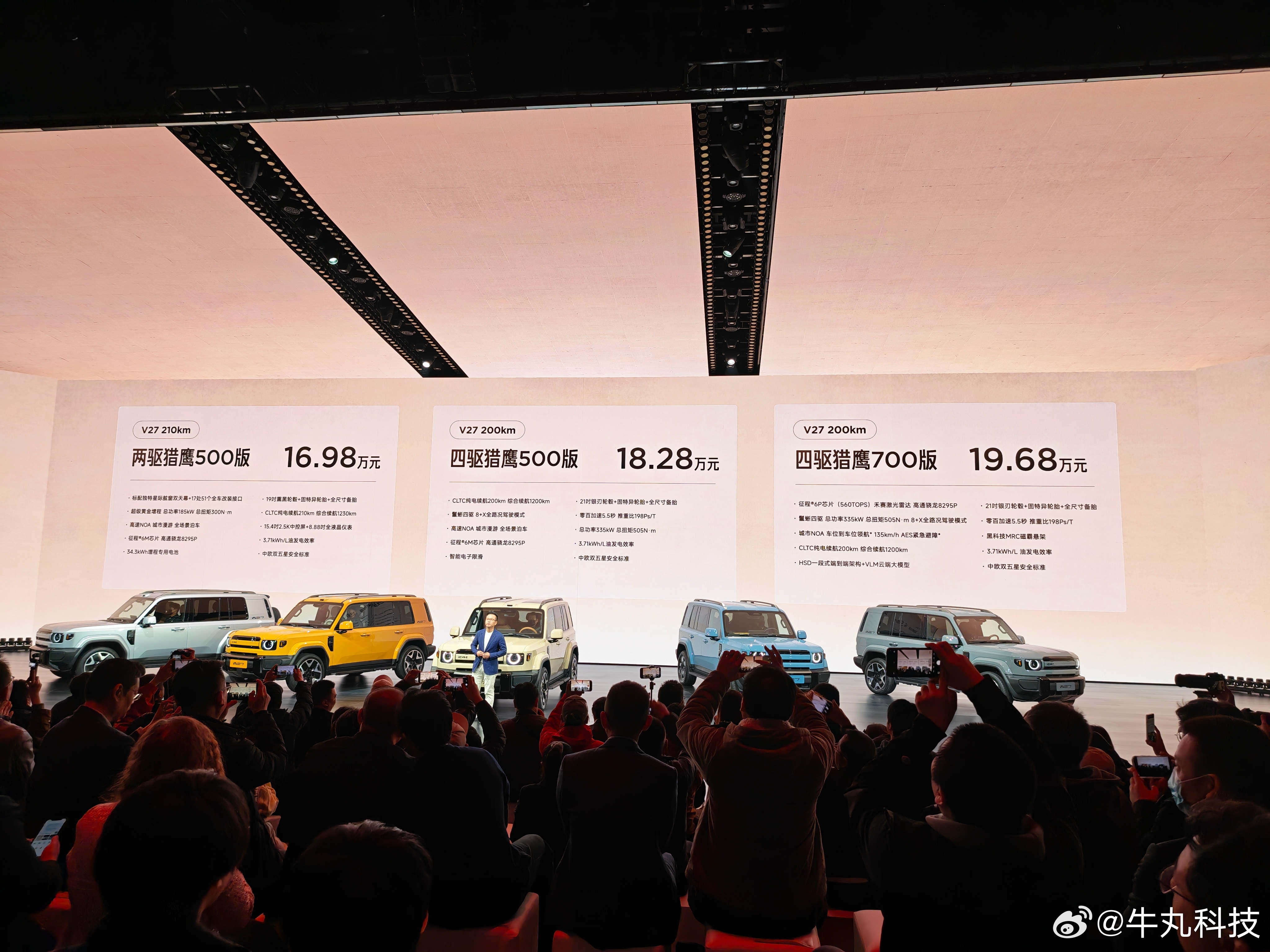 V27 210km两驱猎鹰500版:16.98万元V27 200km四驱猎鹰500版:18.28万元V27 200km四驱猎鹰700版:19.68万元