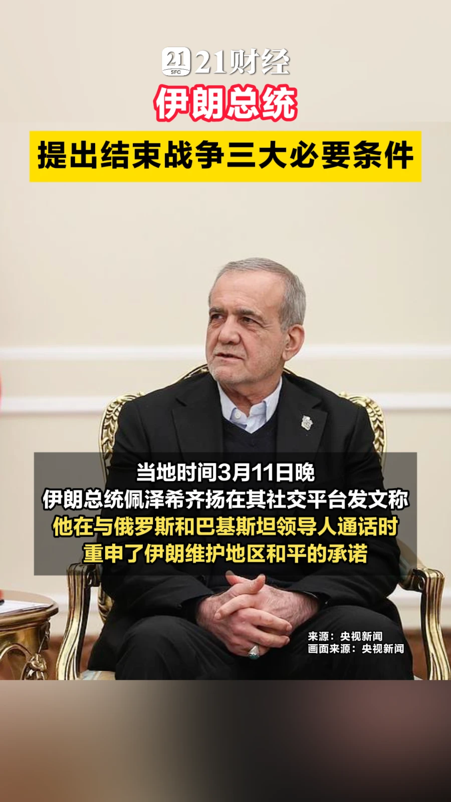 当地时间3月11日晚,佩泽希齐扬在与俄罗斯和巴基斯坦领导人通话时,首次公开提出结束战争的"唯一途径":承认伊朗的合法权利、支付战争赔偿,并由国际社会提供防止未来侵略行为的坚定保障。