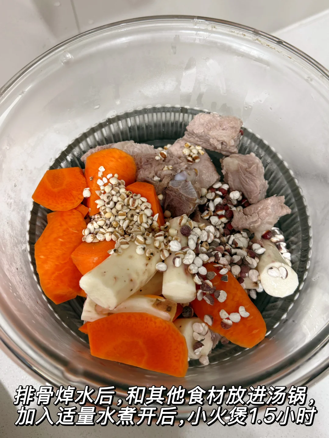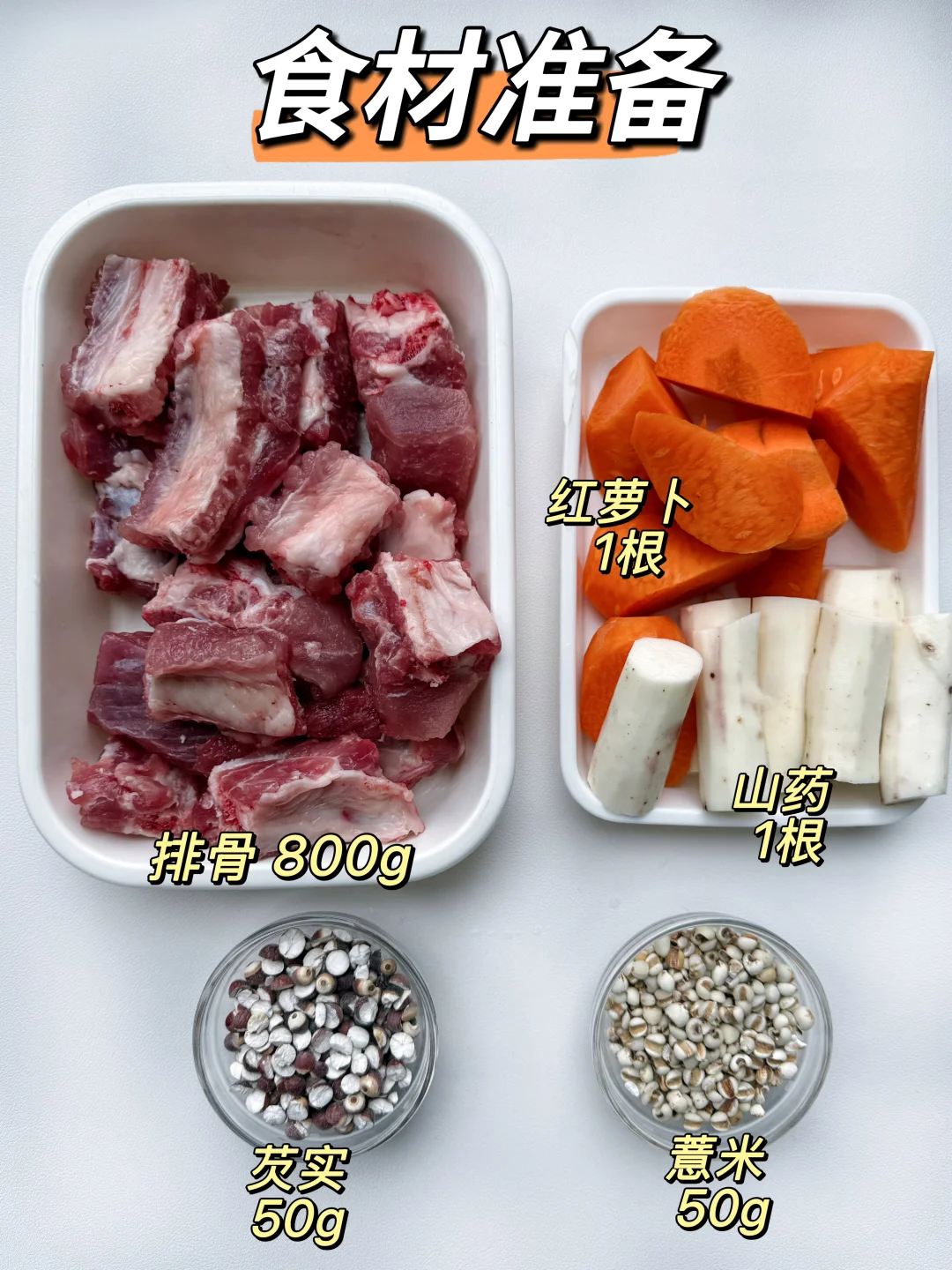 排骨 800g、铁棍山药 1根、薏米 50g、芡实 50g