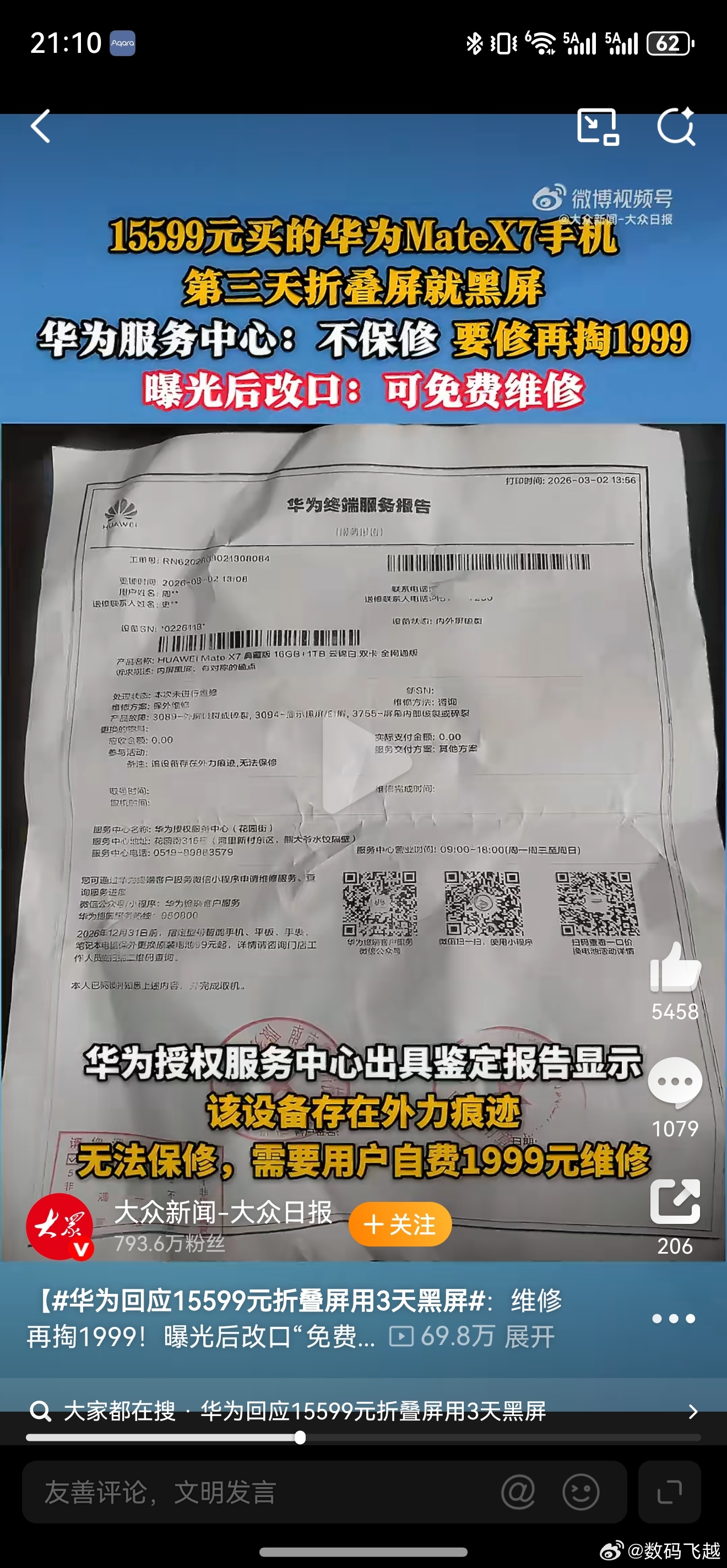 华为回应15599元折叠屏用3天黑屏华为回应在哪里?现在的人做话题都这样了吗?拿