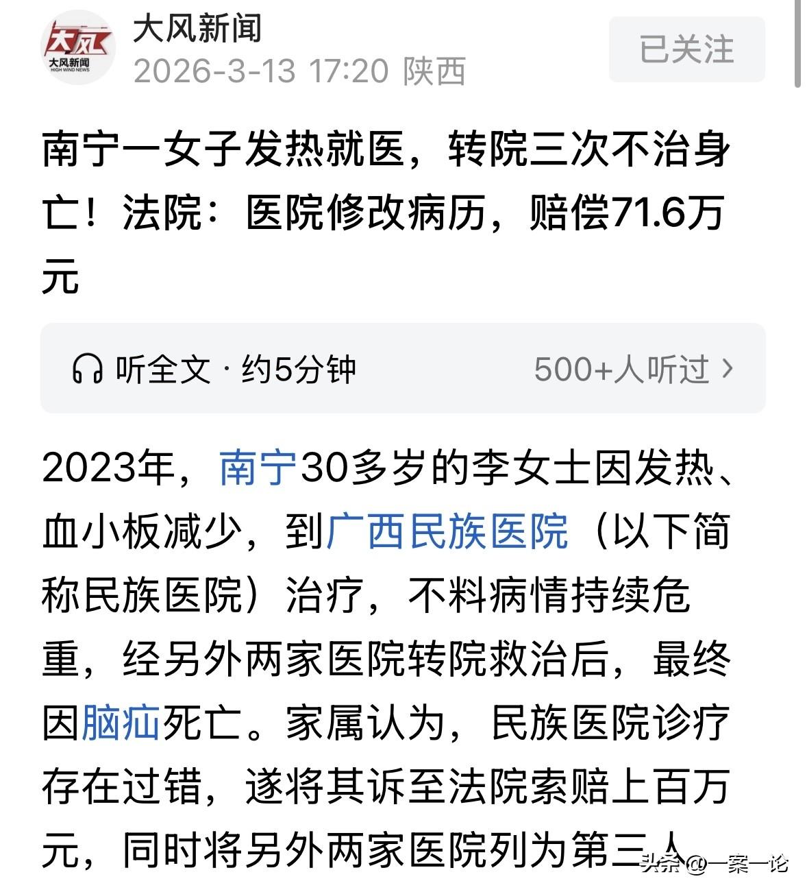 广西南宁,30岁女子发热一周不见好,就去医院治疗,结果病情越治越严重,家属看情况不妙,连忙带她转了2家医院,可女子最终还是因为脑疝死亡了。家属觉得第一家医院治疗大有问题,耽误了女子的病,直接诉至法院索赔上百万,同时追责了另外两家医院。法院审理时发现一个关键细节,而正是这个细节,让家属获得了71.6万的赔偿。 2026年3月12号,法院的一纸判决,让李女士的家属终于长出了一口气,但手里那71万多的赔偿款,却怎么也换不回亲人的命。 事情还得从2023年3月说起。 那时候,李女士因为连续发烧一周,身上还查出血小板急剧减少,赶紧住进了医院。 然而,她在医院治了一周,病情没控制住,反而越来越重,右侧大脑出血,还形成了脑疝。 3月11号,家属看着情况不妙,赶紧办理转院。 可接下来的几天,李女士一直深度昏迷,靠呼吸机吊着一口气。 3月15号,家属实在没办法,签了字带她出院,转头就去了另一家医院。 结果当晚,李女士人就没了。 人走了,家属心里全是没解开的疙瘩。他们觉得医院一开始的治疗就有问题,而且这病走得太急,太蹊跷。 一家人把医院告上了法庭,还要了上百万的赔偿,连后面收治的两家医院也被拉了进来。 打官司得讲证据,第一步就是做鉴定。可这鉴定路走得那是相当坎坷。 2023年4月,家属申请鉴定,摇号选了广东的一家机构,结果人家说这属于病理鉴定,超出范围,退了。 没办法,换一家,又因为各种技术原因被退案。 就在这节骨眼上,家属在核对病历时发现了大问题,那就是电子病历竟然有修改痕迹。 2024年5月,家属申请对电子病历做鉴定。这一查,真相大白。 浙江的一家研究院出具报告:第一家医院光是入院记录就改了3次,违反了“24小时内完成”的规定。患者都出院甚至去世了,医院又回头改了2次病程记录。 鉴定费花了3.3万,结论就四个字:违规修改。 因为病历被改得面目全非,后面几家鉴定机构一看这材料,头都大了,要么退案,要么直接不受理。 没有鉴定结论,这责任咋算? 法庭上,医院强硬表示:我们改病历是因为病情变化,属于补充修正,没改核心诊断,不是恶意篡改! 她血小板那么低是因为血型稀有,血源紧张,我们尽力了。人死是因为病太重,跟我们没关系。 但法院不这么看。 法院审理认为,虽然没鉴定出具体的诊疗过错,但法律规定得很清楚:医疗机构违规修改病历,直接推定有过错。 病历是医生写的,你改来改去,还改在关键时间点,这就说明心里有鬼,或者是想掩盖什么。 《民法典》第1222条规定:患者在诊疗活动中受到损害,有下列情形之一的,推定医疗机构有过错:违反法律、行政法规、规章以及其他有关诊疗规范的规定;遗失、伪造、篡改或者违法销毁病历资料。 医院多次修改入院记录及病程记录,违反病历书写规范,属于法定“篡改病历”情形。 这种行为直接推定医院存在过错,无需鉴定即可认定。 虽然因为病历失真导致无法进行医疗过错鉴定,但法律推定填补了证据空白。 最后,法院综合考虑,虽然李女士自身病情极重,但医院改病历这事儿性质恶劣,判医院承担50%的责任。 法院结合患者自身危重病情,判令医院承担50%责任,既惩戒了医疗机构的不诚信行为,也保障了患者家属的合法权益。 至于死亡赔偿金、丧葬费这些加起来132万多,医院赔一半就是66万多。 再加上精神抚慰金2万,还有那3.3万的鉴定费全由医院出。 最后算下来71.68万,这是法院给出的数字。 对于失去亲人的家属来说,这或许不仅仅是钱,更是一个迟到的公道。 对于这件事,你怎么看? 欢迎关注@一案一论