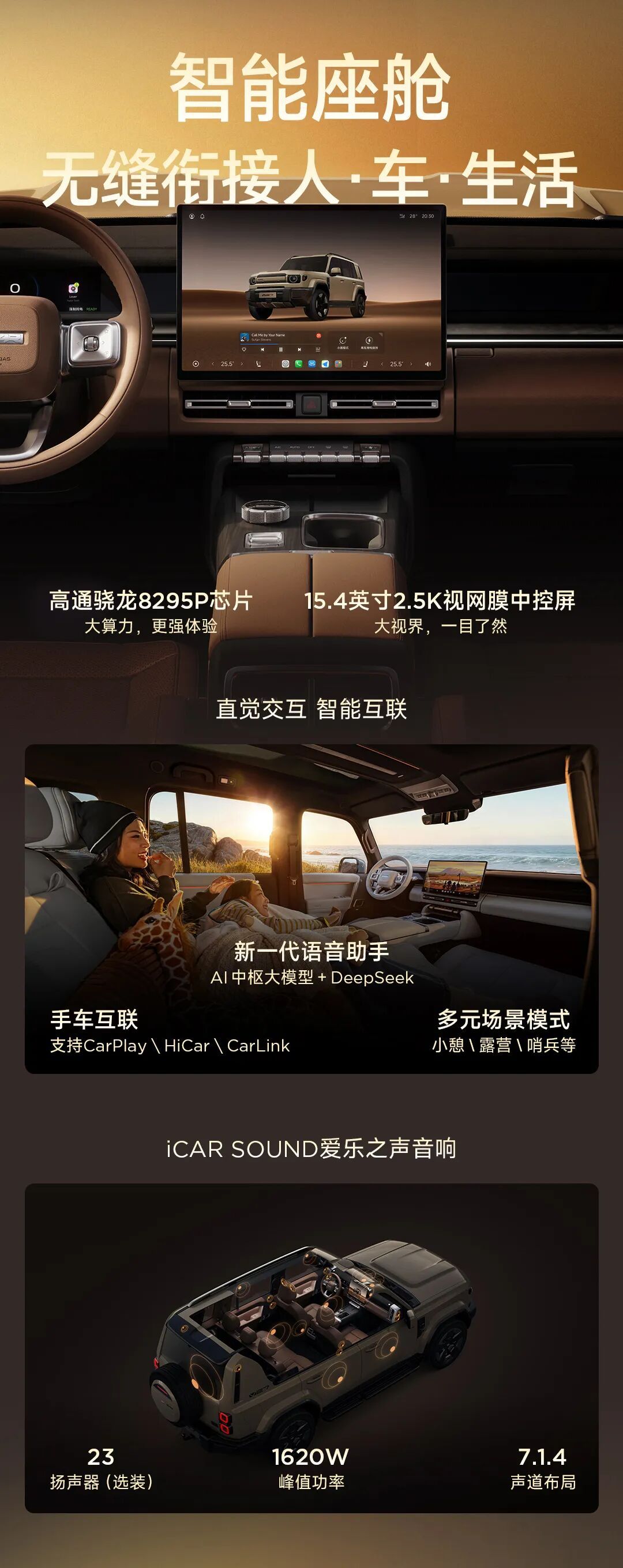 全系标配高通骁龙 8295P 芯片,具备 30TOPS AI 算力,语音助手融合 AI 中枢大模型 +DeepSeek,支持四音区识别。