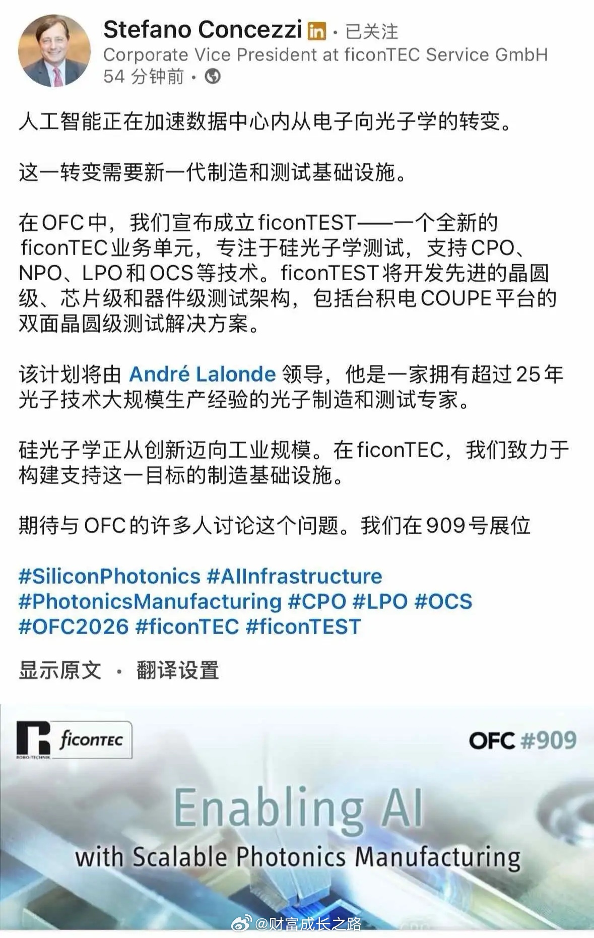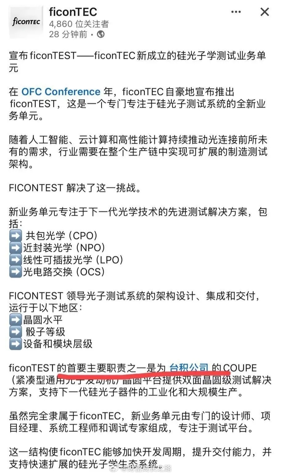 在OFC中,我们宣布成立ficonTEST,是一个全新的ficonTEC业务单元,专注于硅光子学测试,支持CPO、NPO、LPO和OCS等技术。