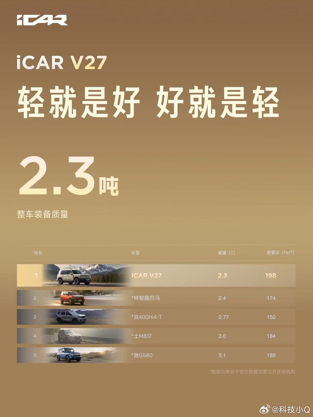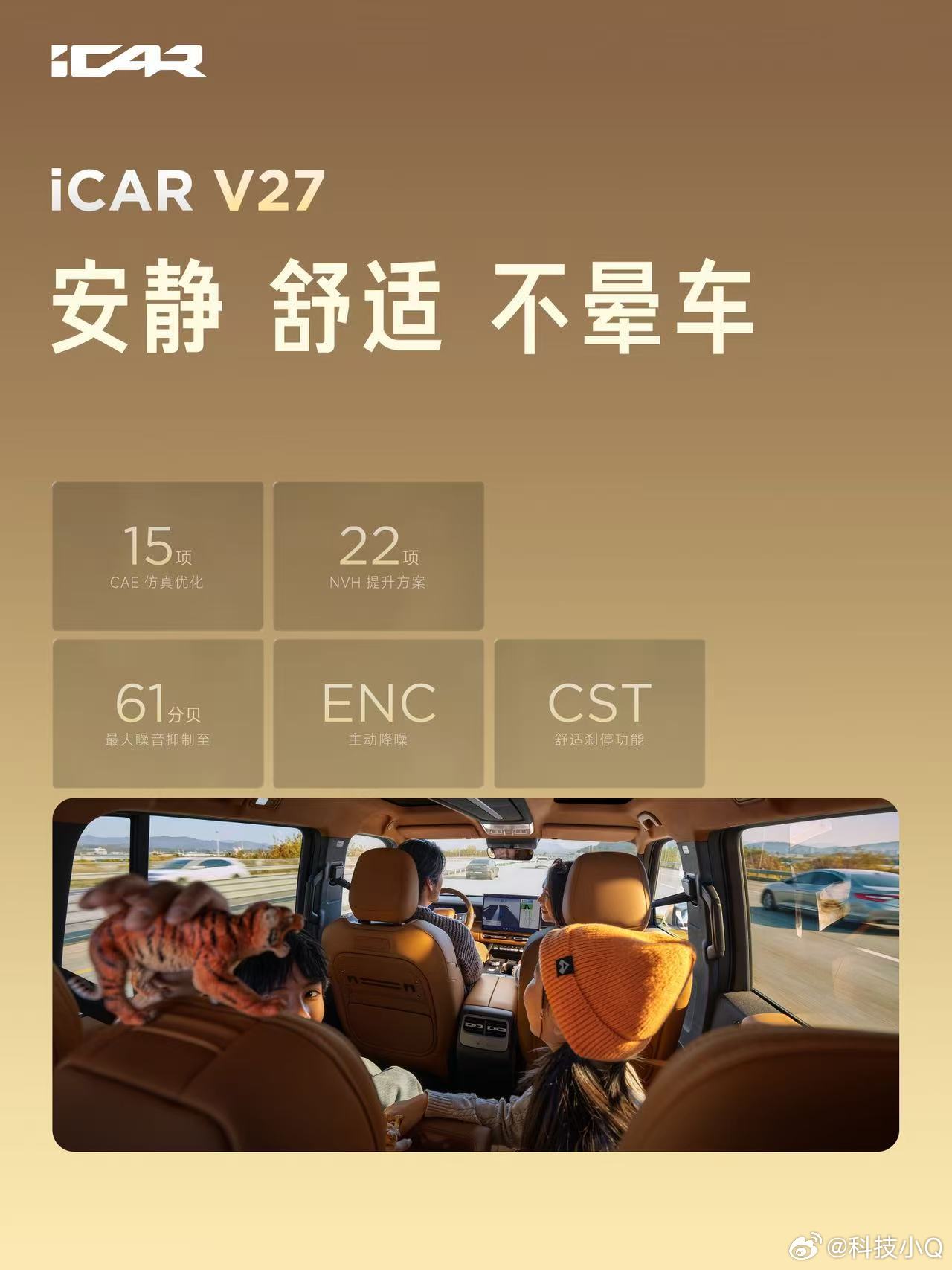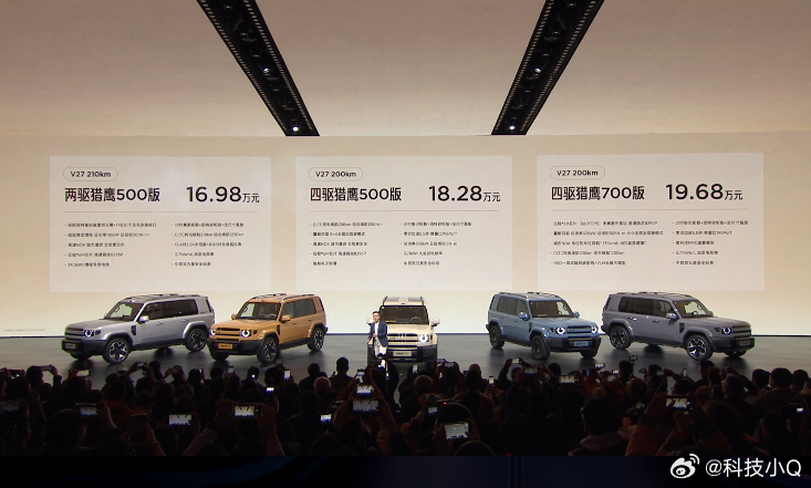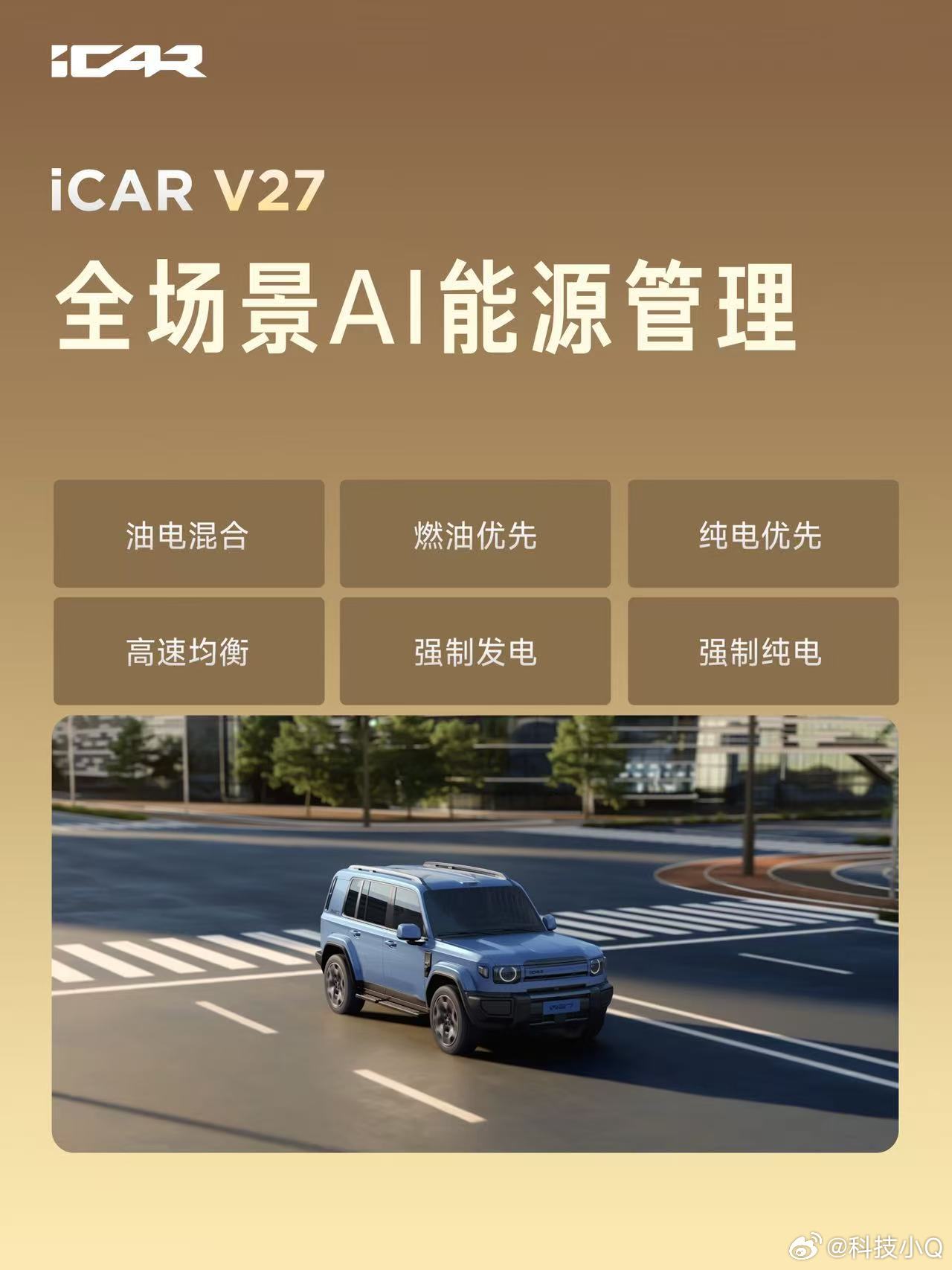 V27全能硬派全家都爱 辅助驾驶:搭载超级猎鹰700+辅助驾驶系统 ,基于地平线征程6P芯片,配备27颗传感器,实现全场景“真人感、超丝滑”智驾体验,支持城市/高速NOA。动力:搭载奇瑞“黄金增程”系统,1.5T发动机热效率45.79%,1升油发电3.71度,纯电续航200km+,综合续航1200km+。设计:“未来经典”设计,1:1黄金宽高比,首创“Scoop”切面与“星际舷窗”双天幕,提供小书包/备胎两种尾门风格。价格: iCARV27全能上市16.98万起