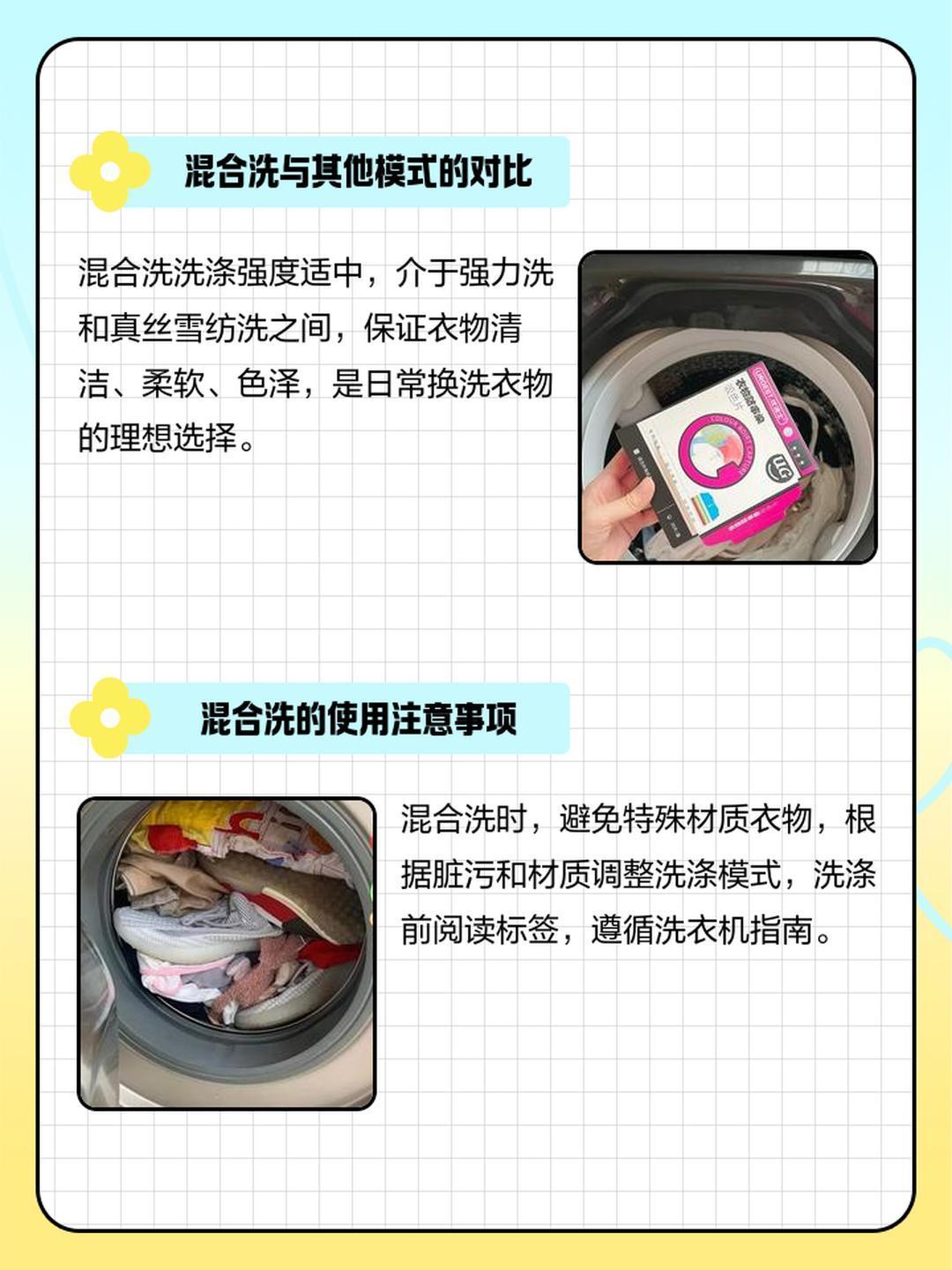 谁家还没因为内衣袜子混洗吵过架 洗衣机的混合洗,真的是个省心又实用的功能!它不仅能处理多种衣物材质,还能确保衣物洗得干净又柔软。如果你还在为每天该选哪种洗涤模式而纠结,那就赶快来了解一下混合洗吧!