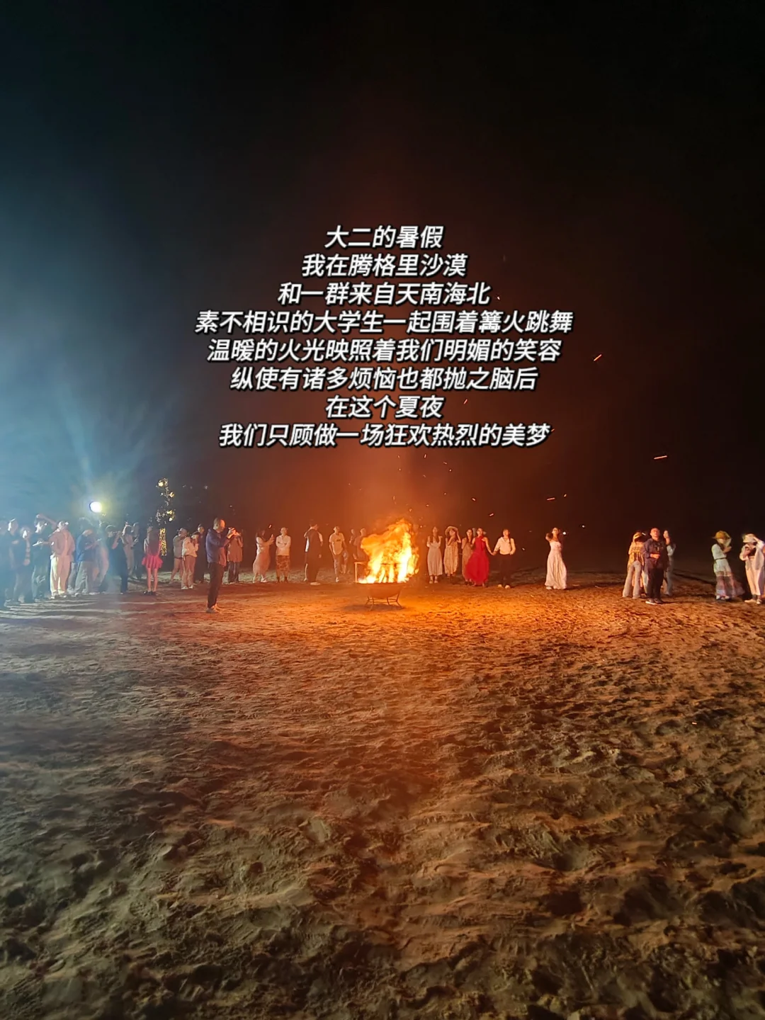 在腾格里沙漠和一群大学生围着篝火跳舞