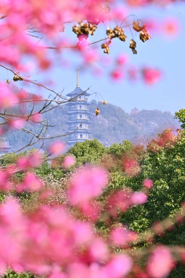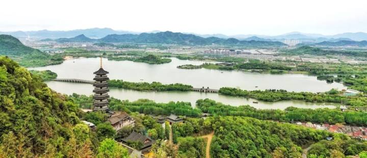 空气能见度高时,可远望钱塘江、富春江、浦阳江三水交汇,烟波浩渺,水天一色,春日的壮阔之美在此展现得淋漓尽致。