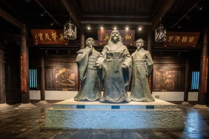 再往上走,便抵达终点越王祠,祠内立着越王勾践、范蠡和文种的雕像,肃穆威严,旁边的陈列架上摆放着旧时的兵器,壁画生动再现了吴越争霸的历史场景。