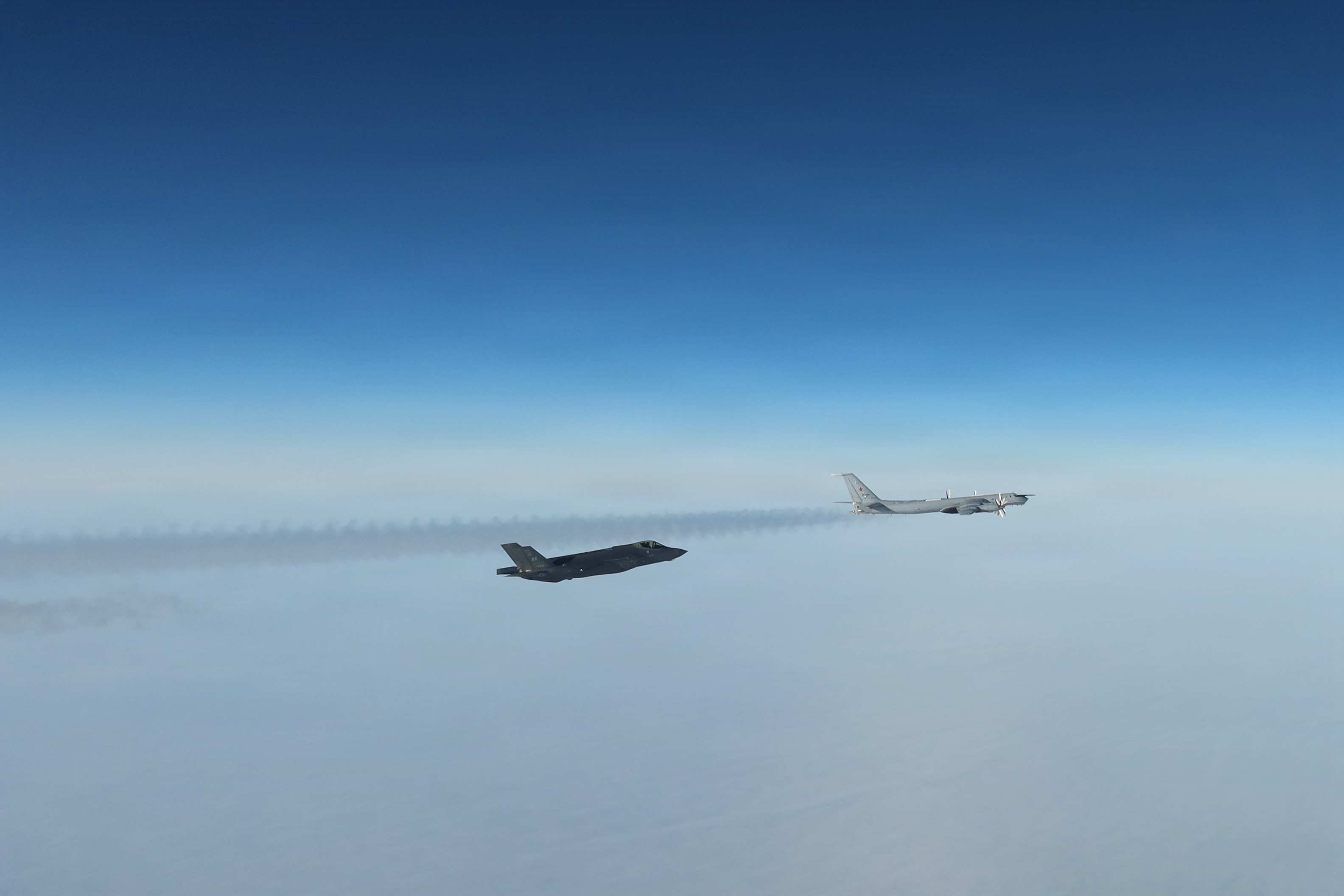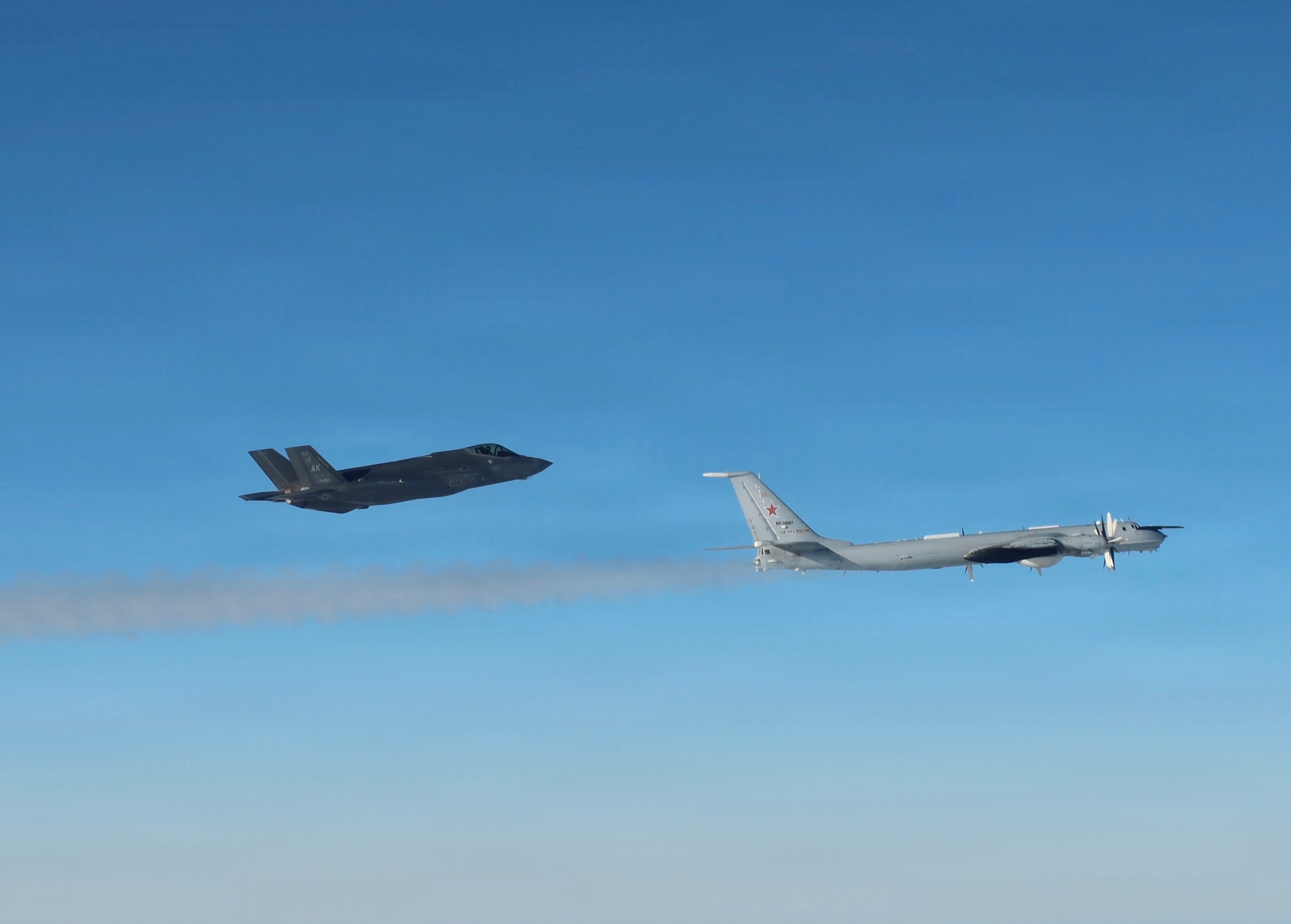 俄罗斯海军太平洋舰队航空兵的Tu-142反潜巡逻机在没有战斗机护航的情况下孤身冲了一波阿拉斯加防空识别区,独自面对美国F-35A和加拿大CF-188A共4架战机的包夹。