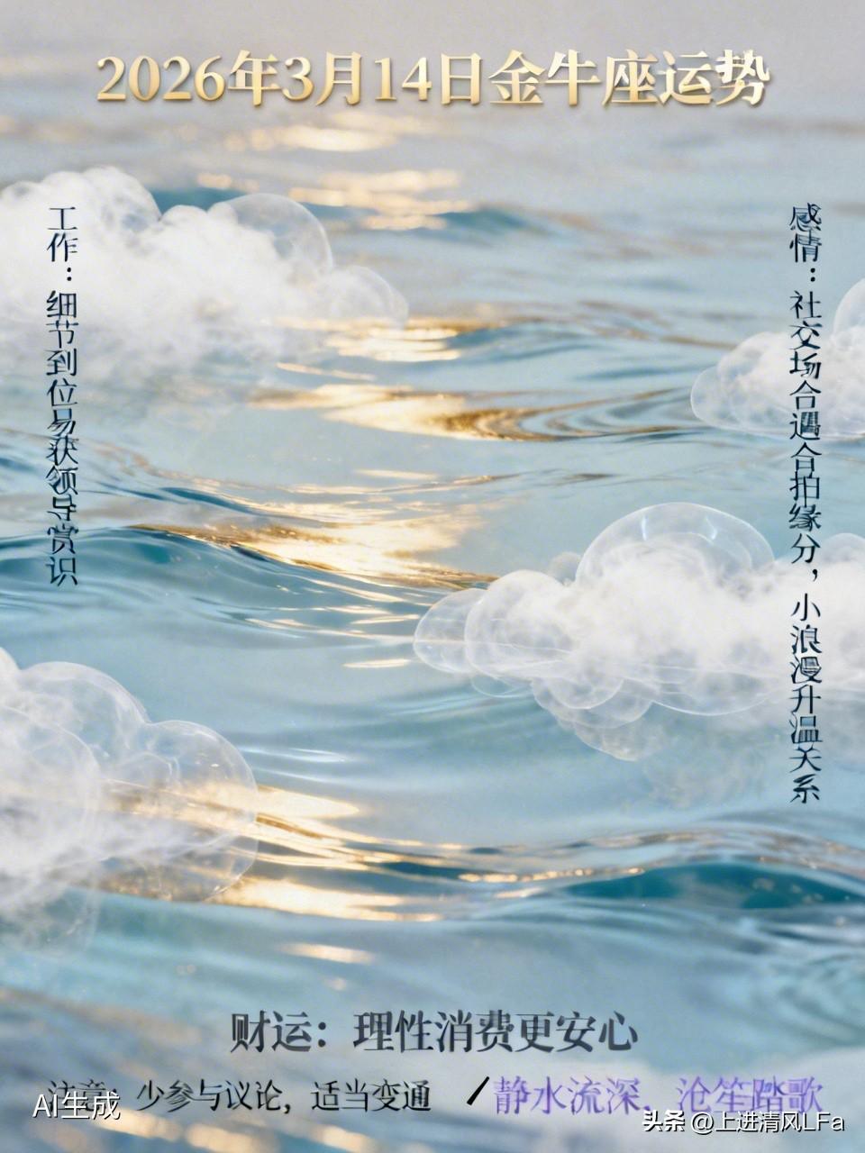 2026年3月14日,对金牛座来说是稳中有喜的一天。这天贵人运悄悄上线,工作上只要细节做到位,成果很容易被领导看见,说不定能得到赏识。 感情方面也不错,单身的金牛座在社交场合可能会遇到合拍的缘分;有伴侣的人,小浪漫能让感情升温。 财运比较平稳,理性消费会更安心。不过这天言行易引发争议,周围热闹事多,最好少参与议论、别凑热闹。另外,别太固执,适当变通,生活会更顺遂。就像名言说的“静水流深,沧笙踏歌;三生阴晴圆缺,一朝悲欢离合”,以平和心态应对就好。