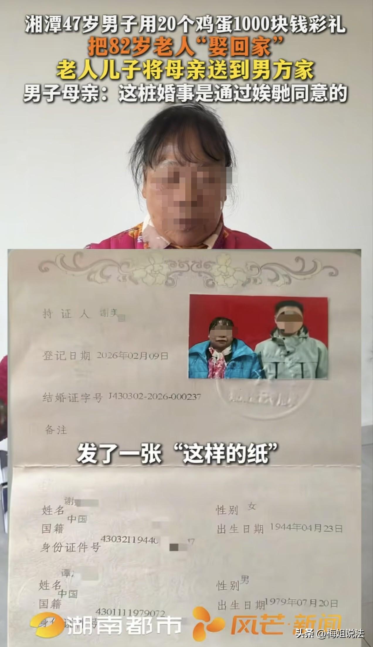 湖南湘潭,82岁的谢奶奶带着20个鸡蛋、1000元现金以及一张纸回家,谢奶奶的儿子以为老母亲去哪里领鸡蛋了,可仔细一看,那张纸赫然是一张结婚证,自己82岁的母亲竟然与一位47岁的陌生男子领了结婚证! 谢某问母亲这是怎么一回事,谢奶奶一脸无辜,她说自己不识字,以为这是假的,自己当时把1000元还回去了,后来男子又硬塞给她了。 谢某顿时被气得火冒三丈高,年过半百,自己竟然又多了一位比自己还小的父亲! 谢奶奶像往常一样出门溜达,没想到出门却遇到一个奇奇怪怪的男子,男子莫名其妙地给了她20个鸡蛋,又给了她1000元,说什么要和她结婚。 谢奶奶以为男子是在说假话,可能是领一个假的结婚证,就收下了鸡蛋,又把1000元还给了男子。 男子以为谢奶奶是同意了,于是就带着谢奶奶回家拿身份证,同时硬把1000元塞给了谢奶奶。 就这样,谢奶奶被这名男子带到了结婚的地方。 谢奶奶回忆说,当时那个工作人员也没有说什么话,谢奶奶就更加确信自己是在和男子领一个假的结婚证。很快工作人员就给他们拍好了照片,给他们分别发了一张纸。 谢奶奶回家的时候,很高兴,心想自己只是领一个假的结婚证,就领了20个鸡蛋和1000元,今天的日子真是太好了。 回到家,起初谢奶奶的儿子谢某见谢奶奶拎着20个鸡蛋回来,没有往心里去,只以为老人家又在哪里领到了免费鸡蛋。可在不经意间瞥到谢奶奶拿着的红色纸张的时候,谢某却急眼了。 谢某三步并作两步抢过那张纸,仔细一看,那竟然是一张结婚证,结婚的人赫然就是他82岁的老母亲,而另一方则是一个47岁的陌生男子。 谢某当时就觉得离谱到家了,自己的老母亲出门一趟怎么就给自己找了一个比自己还小的父亲呢?两人之前足足差了35岁啊,平时也不见老母亲有什么老相好啊。 谢某强压着火气问自己的母亲到底是怎么一回事。 谢奶奶却是一脸无辜,自己又没读过书,不认识字,怎么知道这个竟然是真的结婚证。当时工作人员也没有跟她说啊! 谢奶奶顿时慌了神,自己这么大的岁数了,稀里糊涂地结了个婚,这不得把街坊邻居笑死。 谢某听了母亲的话,又听母亲说什么户口迁移手续,顿时火冒三丈高,他喊来自己的儿子。于是谢奶奶的儿子和她的孙子,就架着她找上了男方的家。 当时男方家里只有男方的母亲在,谢某一见人就阴阳怪气道:你不是要迁户口吗?现在我就把我娘给你送过来了。 男方的母亲见谢某一行人来势汹汹一下就炸了,她说:你们要做什么,做什么,把她带到这里干什么? 看来男方的母亲并不想要谢奶奶住到她们家里,那么他们要迁户口做什么?她又说:这件事情,是她自己同意的,你们现在到我这里闹什么闹? 目前男方还没有出面,也没有对什么要和谢奶奶结婚做解释。 有人猜测男方是想多分一点拆迁款,有人认为是男子那么大了还没结婚,觉得丢脸就随便找谢奶奶领了个结婚证,还有网友说男子恐怕欠下了许多钱,和谢奶奶结婚是想要分担债务。 具体是个什么样的情况还需要后续的调查,那么谢奶奶的婚事怎么办呢?男子的行为是否触犯了一些法律呢? 《民法典》第一百四十八条一方以欺诈手段,使对方在违背真实意思的情况下实施的民事法律行为,受欺诈方有权请求人民法院或者仲裁机构予以撤销。 这起让人大跌眼球的事件中,谢奶奶不识字,被20个鸡蛋和1000元哄骗,误以为是假证所以才和男子领的结婚证。 所以谢奶奶的真实意思完全就不是和男子结婚,违背了法律,她是受欺诈方,她有权请求撤销自己的结婚。 《刑法》第二百六十六条诈骗公私财物,数额较大的,处三年以下有期徒刑、拘役或者管制,并处或者单处罚金;数额巨大或者有其他严重情节的,处三年以上十年以下有期徒刑,并处罚金;数额特别巨大或者有其他特别严重情节的,处十年以上有期徒刑或者无期徒刑,并处罚金或者没收财产。本法另有规定的,依照规定。 如果后续调查中,该男子结婚的目的是多分拆迁款、分担债务,且已经实施了相关行为。 那么他本来是没有结婚意向的,结婚只是为了达到非法获利的目的,且骗取的金额达到一定的标准,那么他的行为就触犯了相关刑法,他应该为此付出相应的代价。 来源:风芒新闻