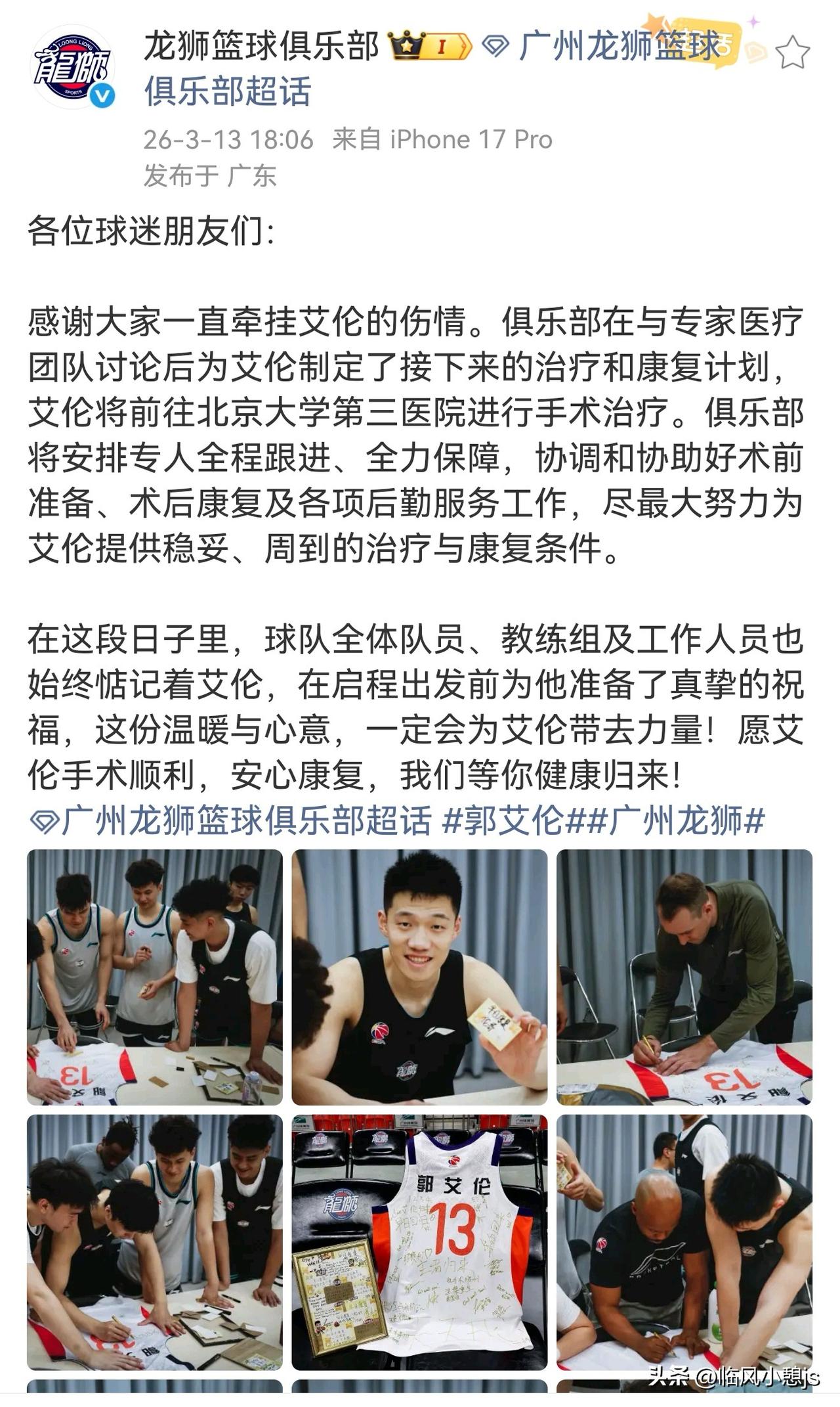 3月5日CBA常规赛,郭艾伦在比赛中左膝受伤,随后他发文称前交叉韧带断了。这伤病可太严重了,像NBA的汤普森、欧文都遭遇过,康复周期漫长。 郭艾伦赛场之上向来活力满格,更是球队的核心得分手,定海神针,此番突遭伤病,所有人都满心牵挂、忧心不已。 龙狮篮球俱乐部反应倒是挺快,第一时间发布消息报告伤情,还承诺会尽一切努力让他接受最好的康复治疗。这态度值得肯定,毕竟球员受伤也不是大家想看到的。 3月13日龙狮篮球俱乐部官宣,郭艾伦不日将赴北医三院接受手术治疗,俱乐部已安排专人全程随行保障。启程前,队友、教练组及工作人员纷纷送上祝福,暖心瞬间让人动容。 球迷们满心感动,龙狮俱乐部对艾伦的用心有目共睹,全网都盼着艾伦手术顺利,早日康复归来,重返赛场! (图片素材来自网络)