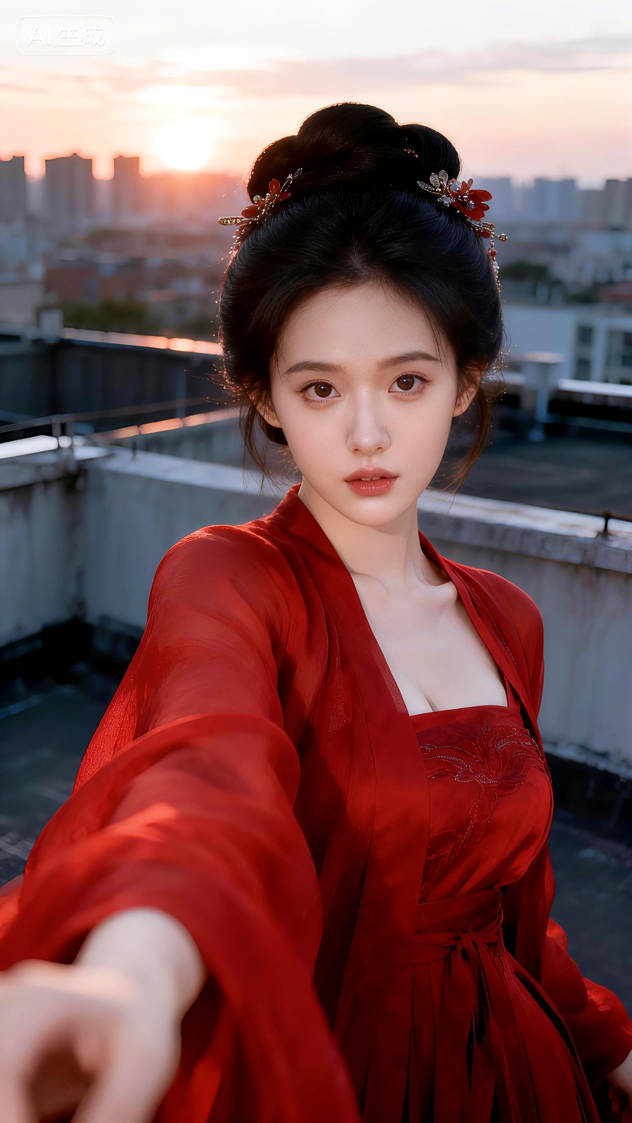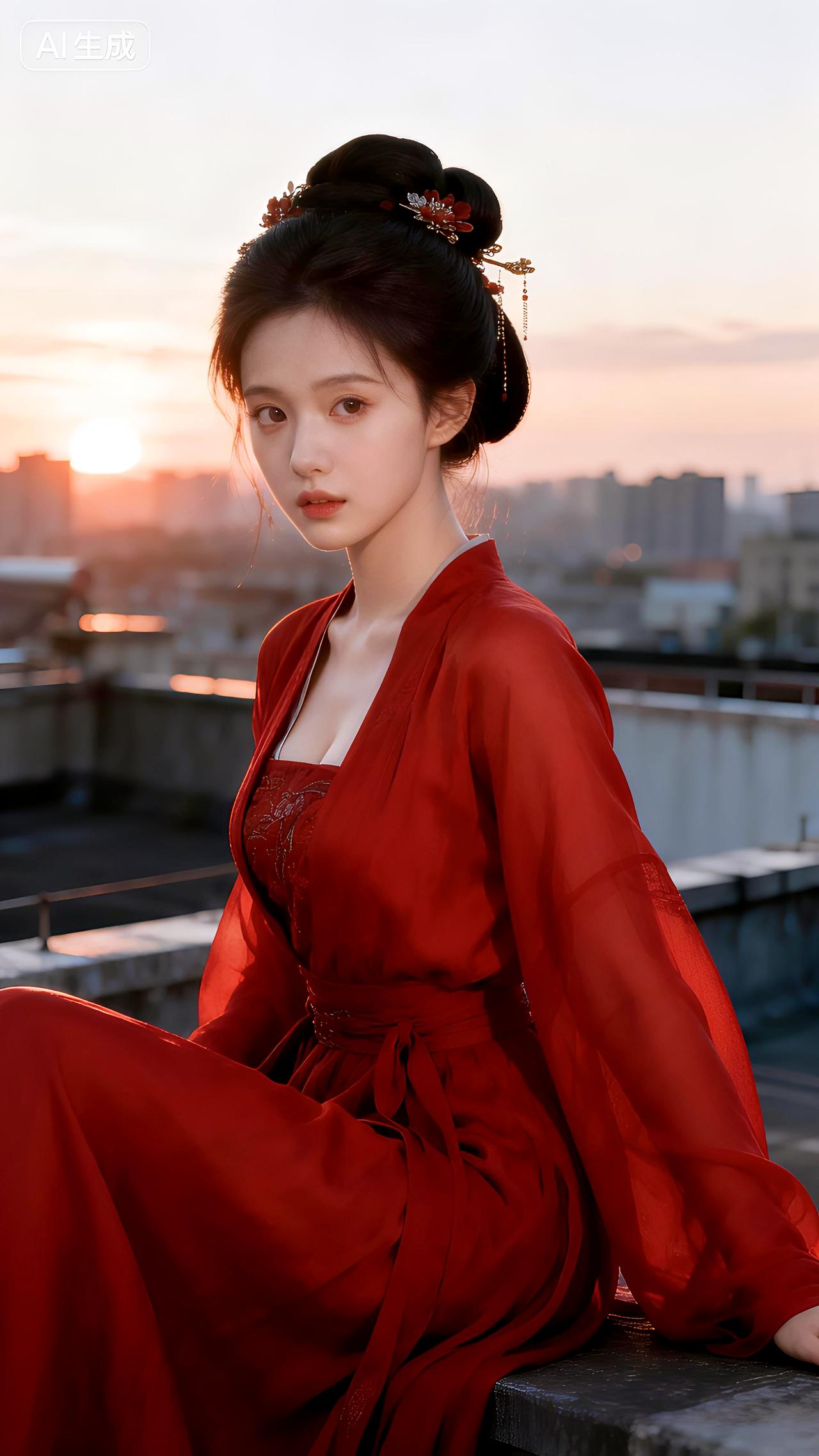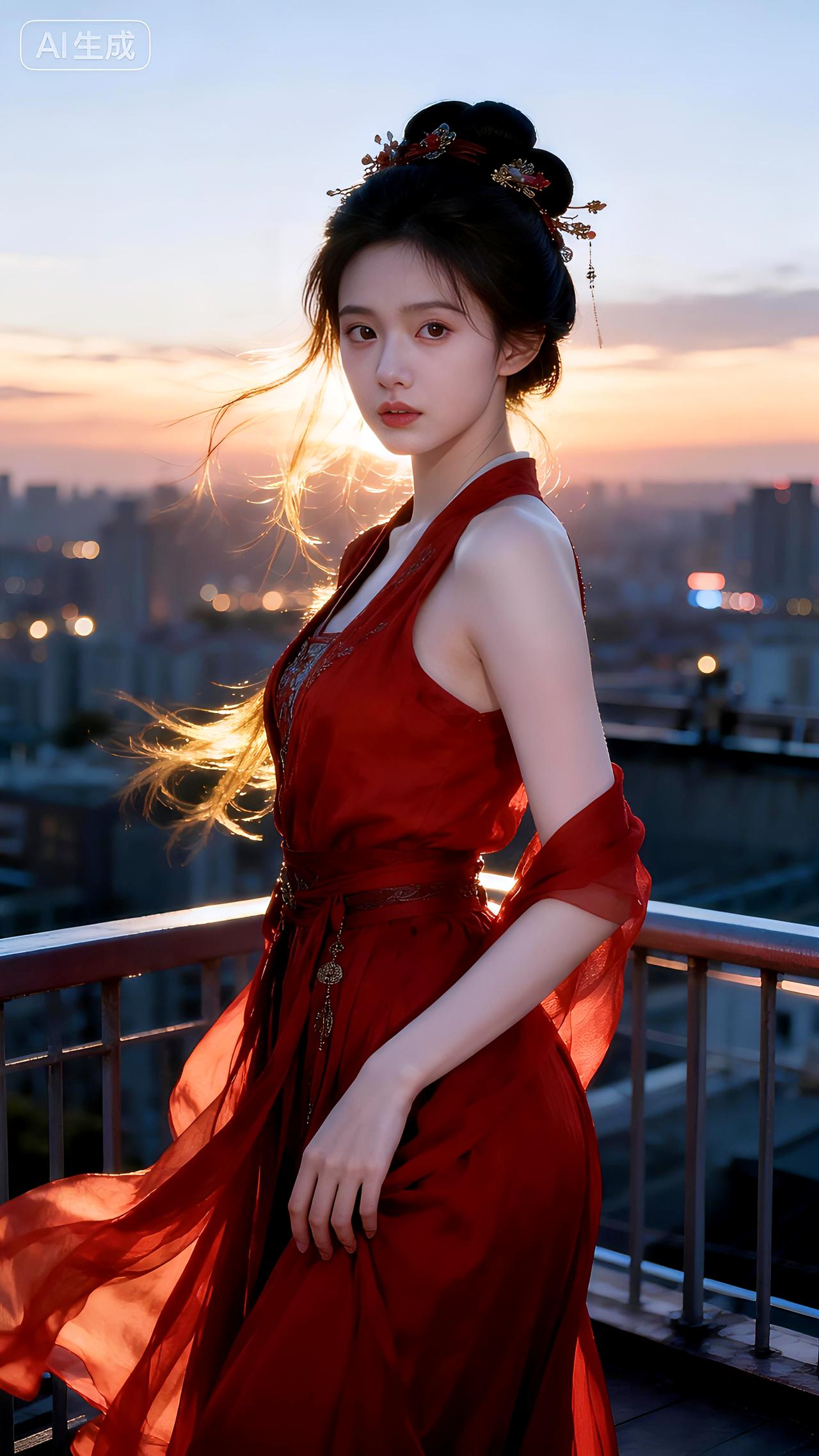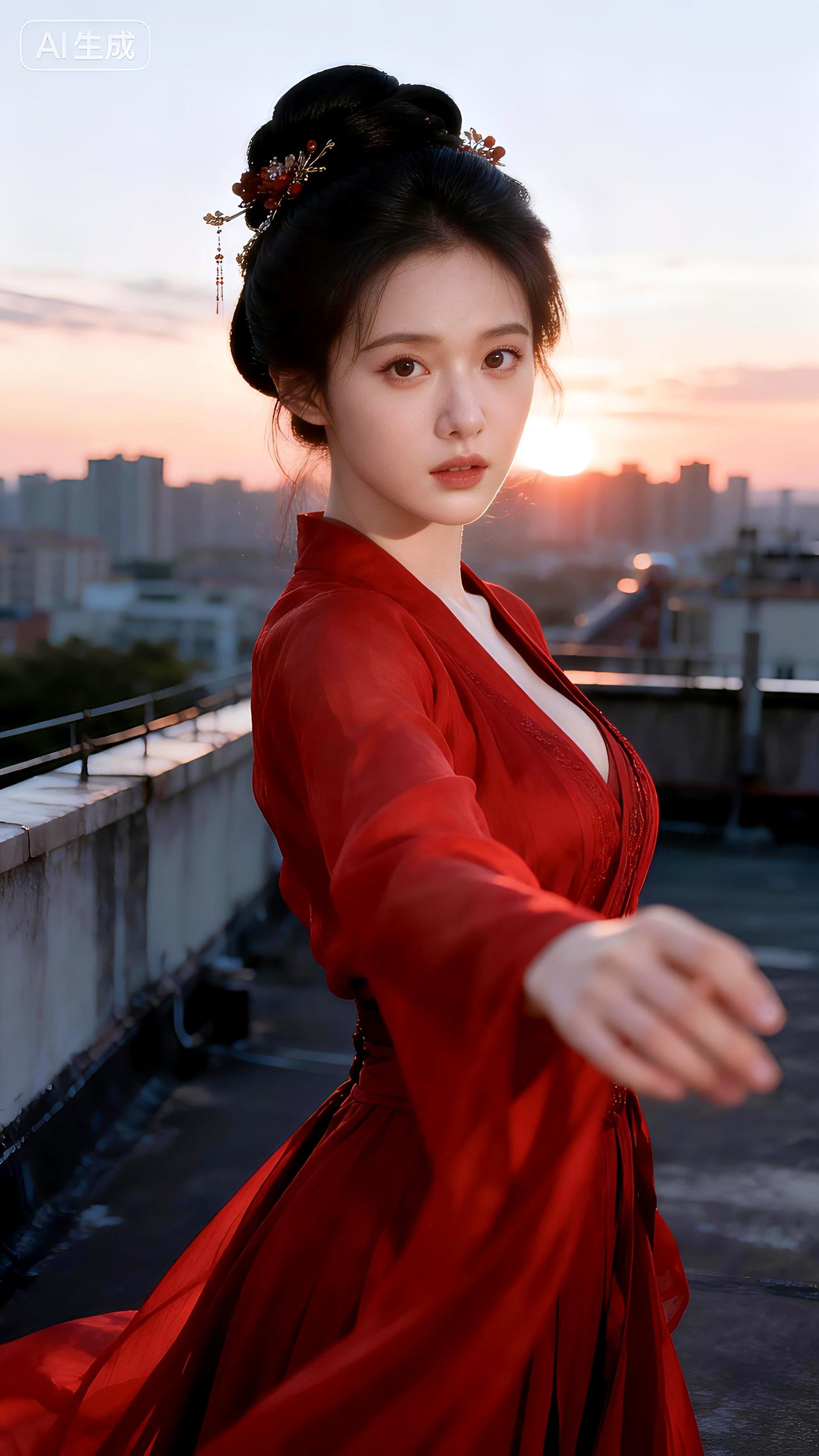 暮色在天台蔓延,红裙如火点燃整座城市的温柔。春日生活打卡季豆包 壁纸 写真