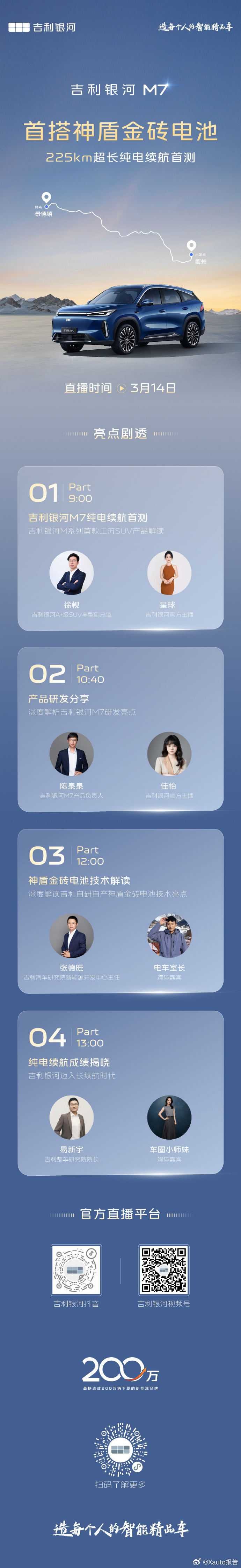 吉利银河迈入长续航时代吉利银河M7完成产品技术首秀,为首搭神盾金砖电池的插混SUV。纯电续航225km,综合续航1730km,快充30%→80%仅15分钟,麋鹿测试81km/h,兼顾长续航、快补能与操控。该车主打日常通勤纯电化、长途无焦虑,同时吉利银河第200万辆整车下线,品牌迈入长续航时代,或将重新定义主流混动市场。吉利银河M系新成员来了吉利银河M7