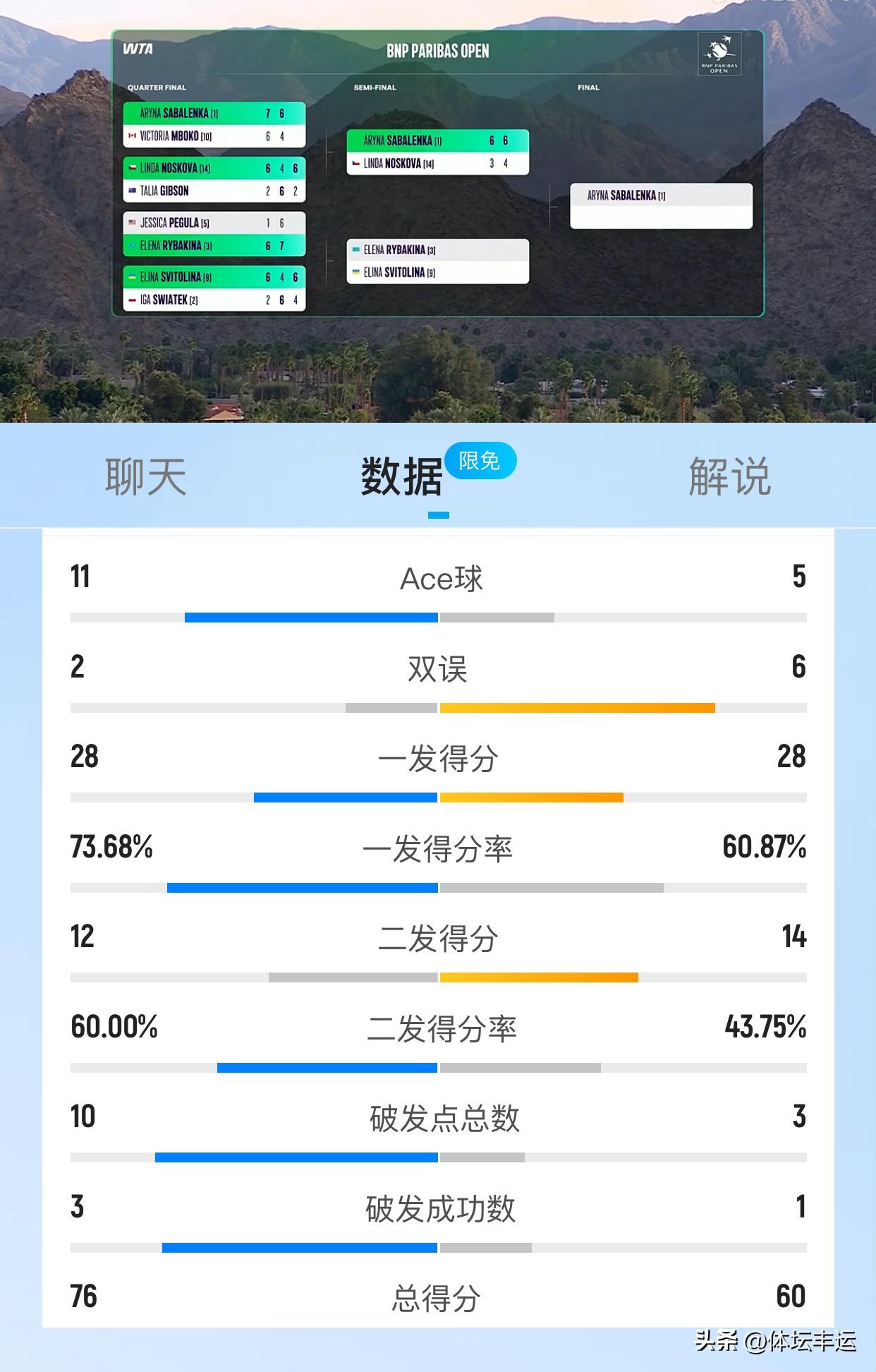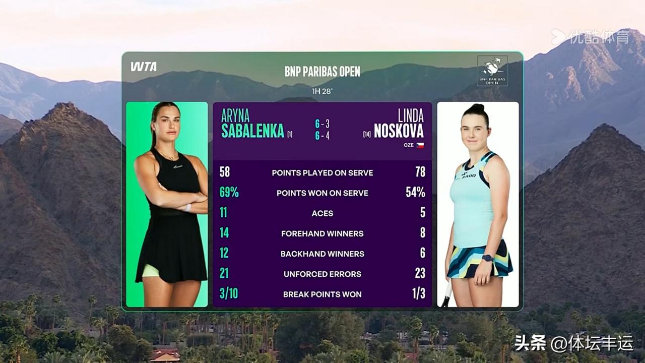 萨巴伦卡横扫诺斯科娃率先晋级印第安维尔斯女单决赛🔥🔥 WTA1000印第安维尔斯女单赛场太精彩!刚刚结束的半决赛第一场,头号种子萨巴伦卡2-0横扫14号种子诺斯科娃,率先晋级决赛,这是萨巴伦卡连续三年闯入印第安维尔斯女单决赛! 首盘萨巴伦卡火力全开,仅耗时37分钟就以6-3拿下。她先是各自保发后率先破发,之后一路领先,虽诺斯科娃有回破,但还是难挡萨巴伦卡的攻势6-4赢下比赛! 其实在之前的1/4决赛,萨巴伦卡就以7-6(0)、6-4直落两盘击败10号种子姆博科。抢七中更是7-0血洗对手,统治力尽显。期待萨巴伦卡在决赛继续封神! WTA单打排名 网球女子赛事