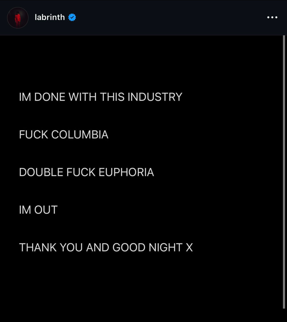 他在一张Notes截图中写道:“我已经受够这个行业……F*** Columbia(哥伦比亚唱片),Double F***《亢奋》。”并表示自己“要离开这个行业”。