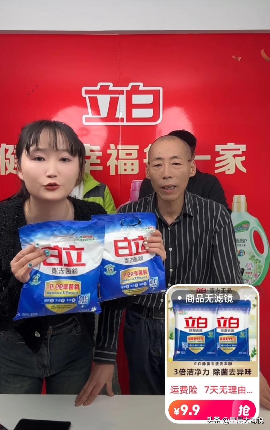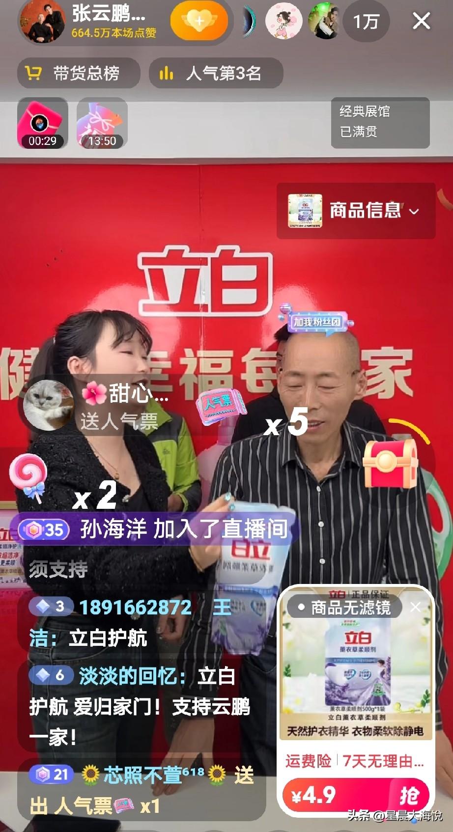张云鹏爸爸今天立白专卖, 开场就给大家发福利,福利袋上挂了两台洗衣机, 之后11.9元的立白柔润洗衣液给到4.99元 还有550克的洗衣粉超市价格是9.9元一袋,在他的直播间里9.9元给两袋确实挺划算的, 今天在线观看人数10000+,没有突然首次直播