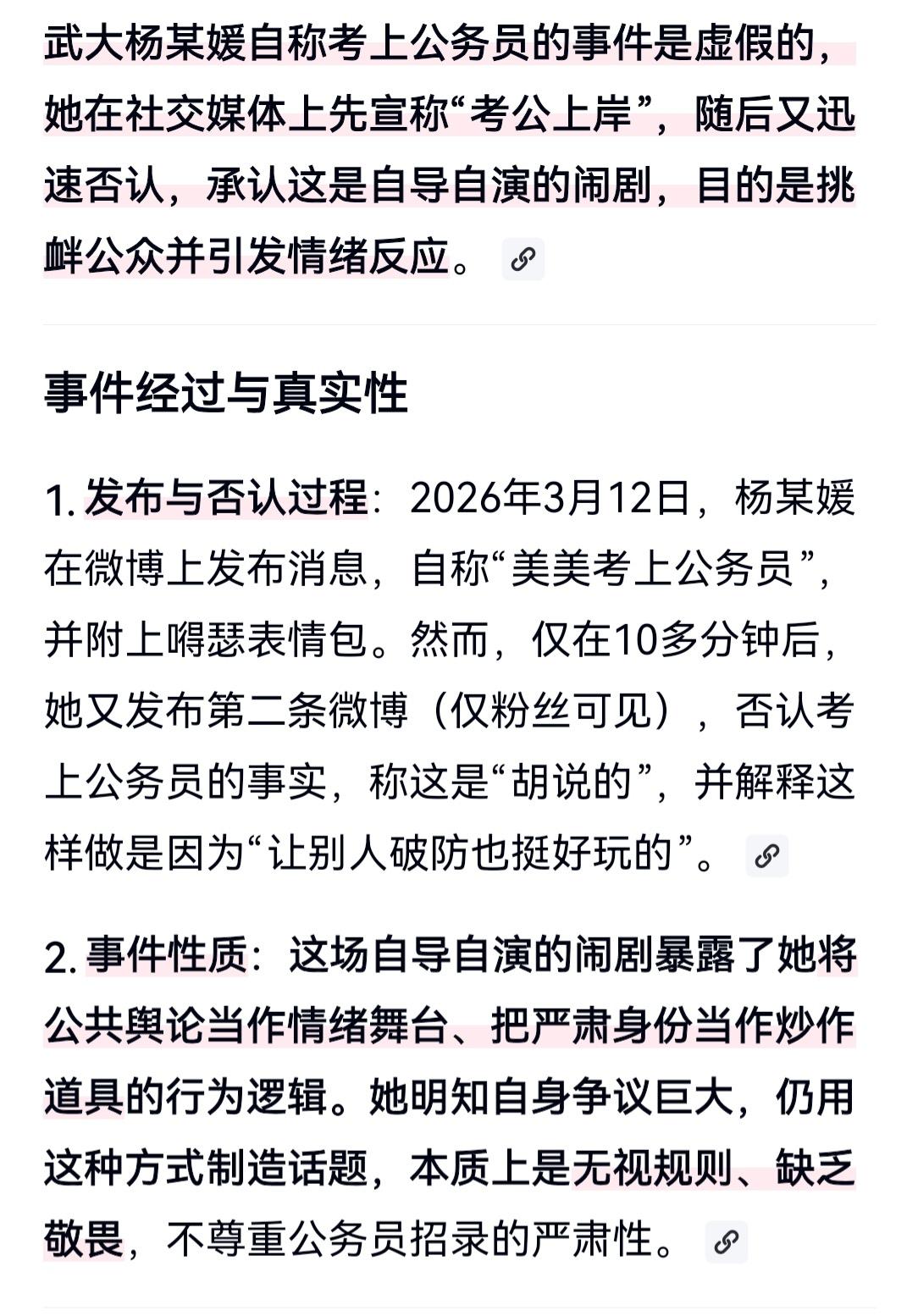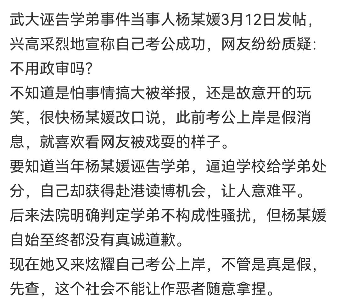 还记得六年前武汉大学的“骚扰”事件吗?就是一个学姐指控学弟在图书馆骚扰自己,差点把学弟逼上绝路,幸好有监控还学弟清白,然而学姐却事了拂衣去,飘然读港博。 那学姐又闹幺蛾子了。 她发文,说自己美美哒考公上岸,成功地引起了网友们的怒火,纷纷质疑考公的审查过程,一片混乱之际,又出来悠哉悠哉地说:逗你们玩呢!就爱看你们气而无能的样子…… 人品,区别确实很大,这位杨博的人品,无怪当年能干那事,实至名归。 不过话说回来,如果杨博真的考公考编,审查关能过吗?好像能,因为人家没有触犯刑律,没有处分,甚至没有留底,程序上没问题。但是,如果网友们揪住不放把事情闹开,她过不了。