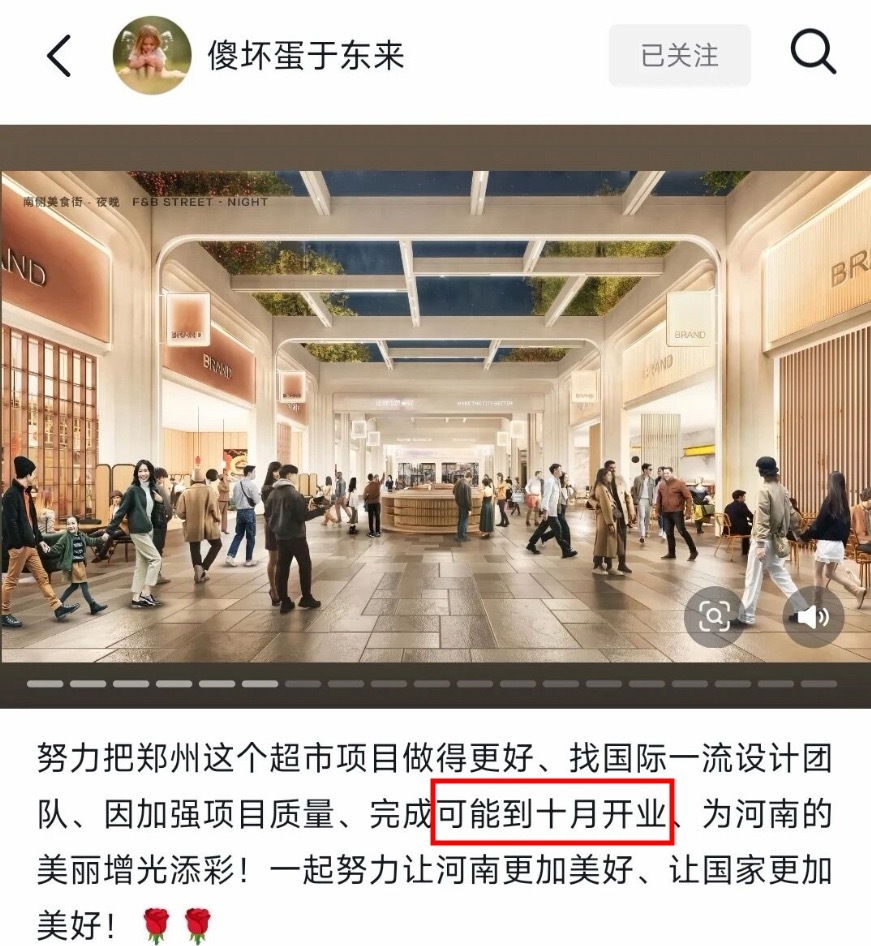 胖东来出来辟谣了,于东来本人也亲自出来发文,官宣郑州胖东来可能推迟到10月份开业并附室内效果图。