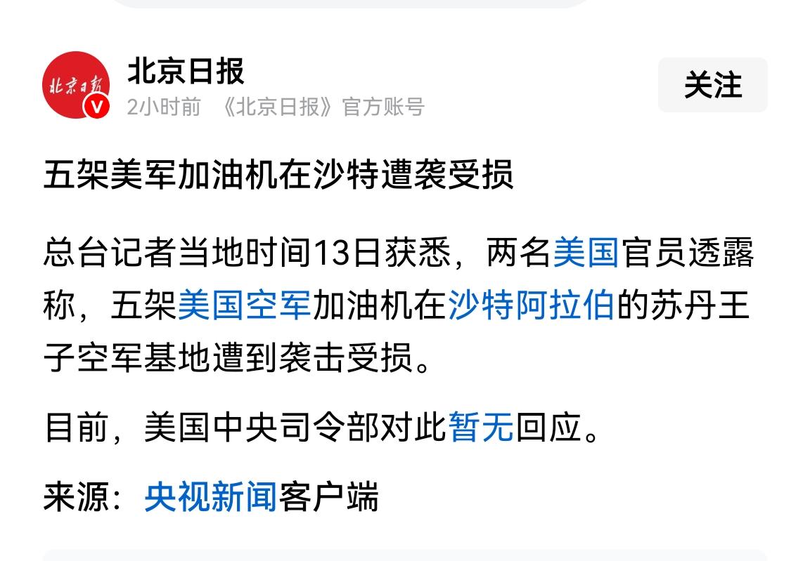 美国这仗还有再打下去的必要吗?五架加油飞机直接在苏丹王子空军基地就被伊朗击中毁坏。 这场本来大家以为会一边倒的战争,现在越来越变味了。甚至有网友说:这或许就是美国的滑铁卢之战。 总之全世界都看清楚了:美国的确老了。
