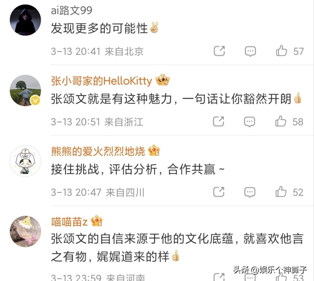 张颂文,硬气回应! 3月14日,演员张颂文上了热搜,这一次,并不是有了新作品,而是出席某活动时接受采访,一番话获得网友称赞,纷纷表示,有实力,就是硬气。 在活动中,被问及AI冲击影视行业是会感到否焦虑,张颂文没有回避,更没有左右而言他,而是直面回答,硬气回应:“这有什么好焦虑的,接纳AI的存在,让观众去发现其与真人的区别,两者并存会更好! 咱就说,有实力,说话就是硬气,强者从来不怕竞争,不抱怨环境,而是不断挑战,AI既然深受观众的喜爱,说明有一定的优点,然而,这并不代表演员就没有了市场,两者结合或许会有不一样的惊喜。 另外,两者各有有点,可以满足不同观众的需求和喜好。 该说不说,张颂文不仅演技好,理解也挺独特,关键是自信满满,乐观又积极,期待给观众带来更多优秀的作品。