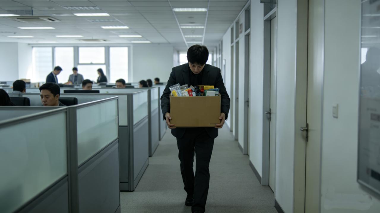 公司裁员名单公布了,小张在上面。 他默默收拾东西,抱着纸箱往外走。路过老板办公室