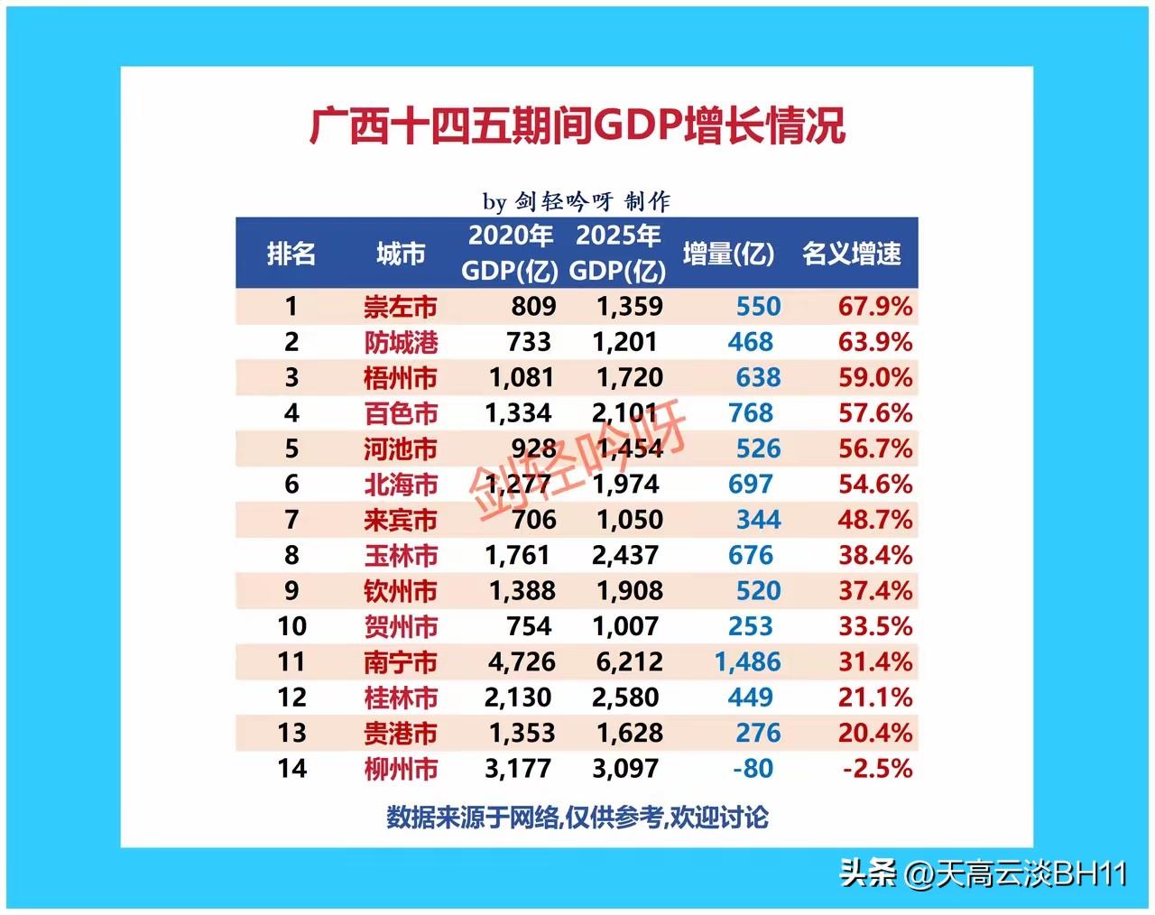不多赘述,直接以数据呈现广西各市在“十四五”期间(2021—2025 年)的经济表现: 增速三强:防城港、北海、梧州 增量三强:南宁、百色、北海 人均 GDP 三强:防城港、北海、柳州 GDP 总量三强:南宁、柳州、桂林 从这四项主要指标来看,北海无疑是最大赢家,在其中三项指标中名列前茅。 有赢家自然就有输家,柳州首当其冲,五年下来经济不增反降;还有钦州,作为一个拥有自贸区和优良港口的沿海城市,却在迷茫中逐渐沉沦。 在季军之争中,五年间玉林在总量上与桂林的差距缩小了 227 亿,到 2025 年两市仅相差 142 亿,桂林压力巨大。 未来的“十五五”,各地又会有怎样的表现呢? 看好南宁和北海。