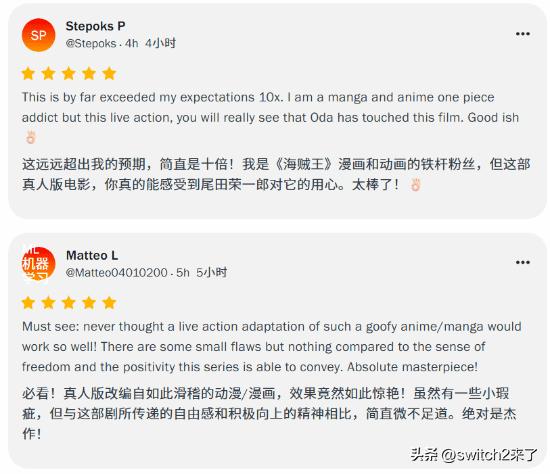 《海贼王》真人版第二季正式开播!让人没想到的是,开片口碑炸裂!截至目前烂番茄媒体均分100,观众均分100! 给出好评的观众表示本剧CG和打斗场面有了全面的升级,远远超出预期!如此惊艳的漫改真人剧集让小瑕疵显得如此微不足道。