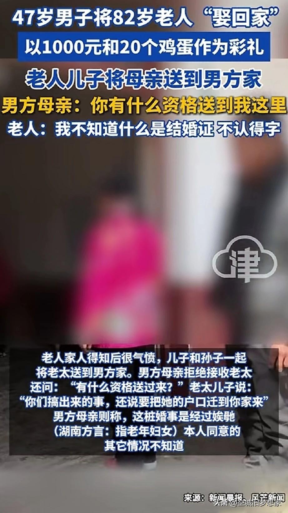 47岁男子,用1000块钱+20个鸡蛋就娶了个媳妇, 让我震惊的不是这微博的彩礼, 而是“娶”回来的媳妇竟是一位82岁老太太。 更离谱的是,老人不识字,以为领的是假结婚证,被对方硬塞了钱就稀里糊涂办了手续。 家人得知后气得把老人送到男方家,男方母亲还反问:“你有什么资格送过来?” 早上刚刚刷到29岁姑娘嫁73岁老头育有一子,现在又来这出,真的震碎三观。 这婚姻到底图啥?是利益算计,还是另有隐情? 世界太大,我的认知真的不够用了…