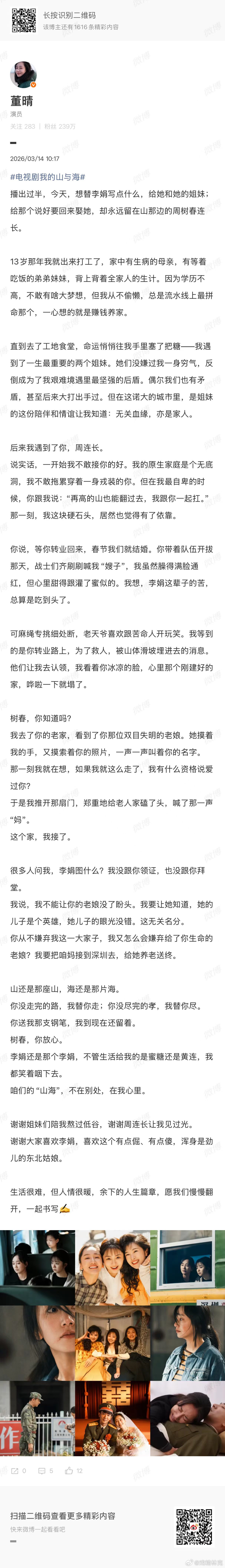 演员董晴的含金量还在上升董晴发长文剖析角色。去年以法之名就贡献了出圈名场面,这次在我的山与海里的演绎也不错