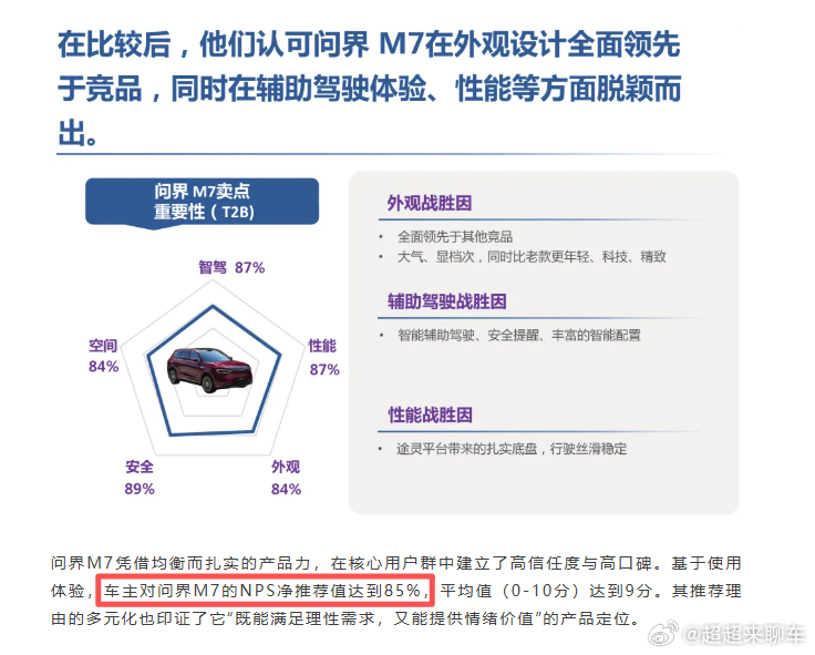 尼尔森报告称问界M7净推荐值达85%在刚刚落幕的AWE展会上,鸿蒙智行再次成为焦点。根据尼尔森最新车主报告,问界M7车主多为年轻高收入家庭,85%的人愿意主动推荐,累计交付量已突破43万台,现在来看国民SUV的口碑,都是广大车主们给投出来的。近9成车主愿意主动推荐问界M7