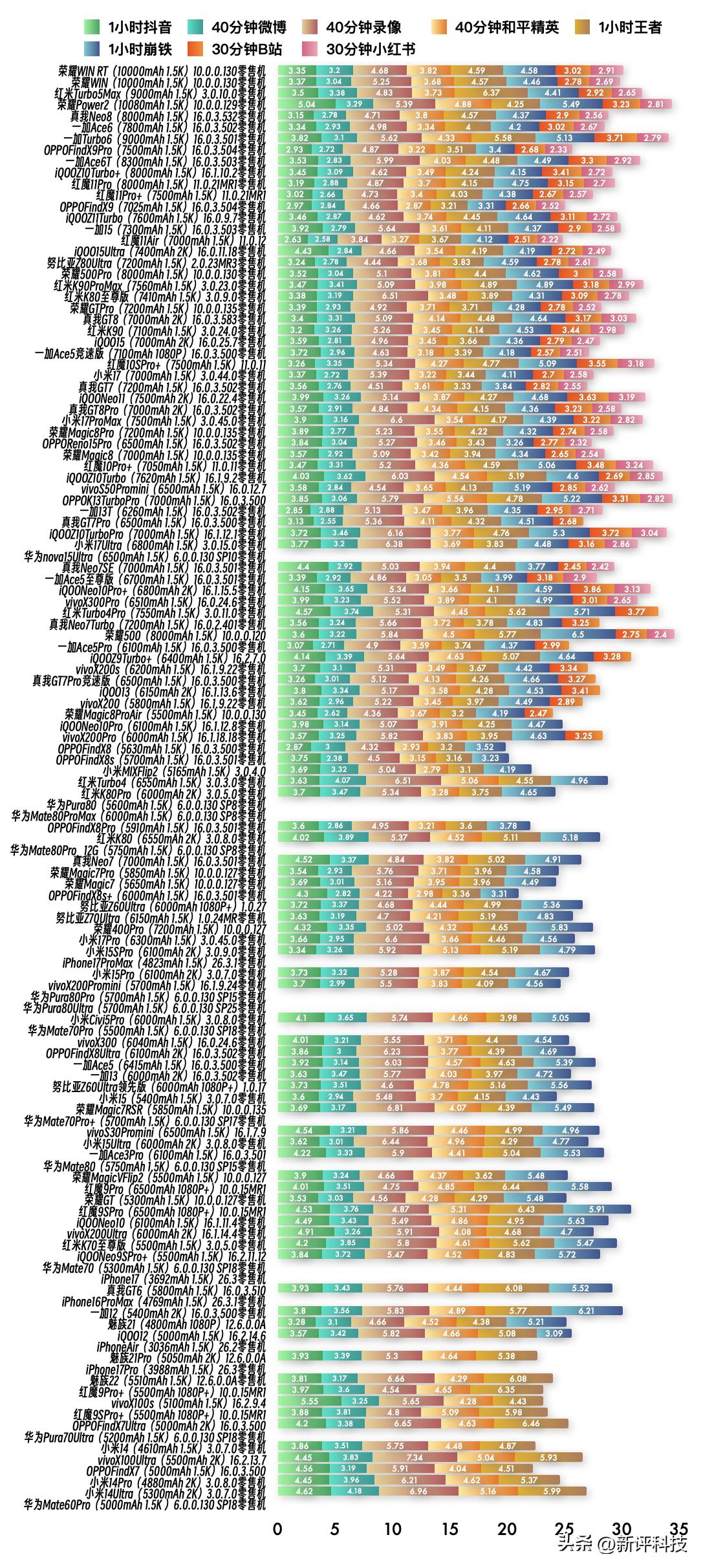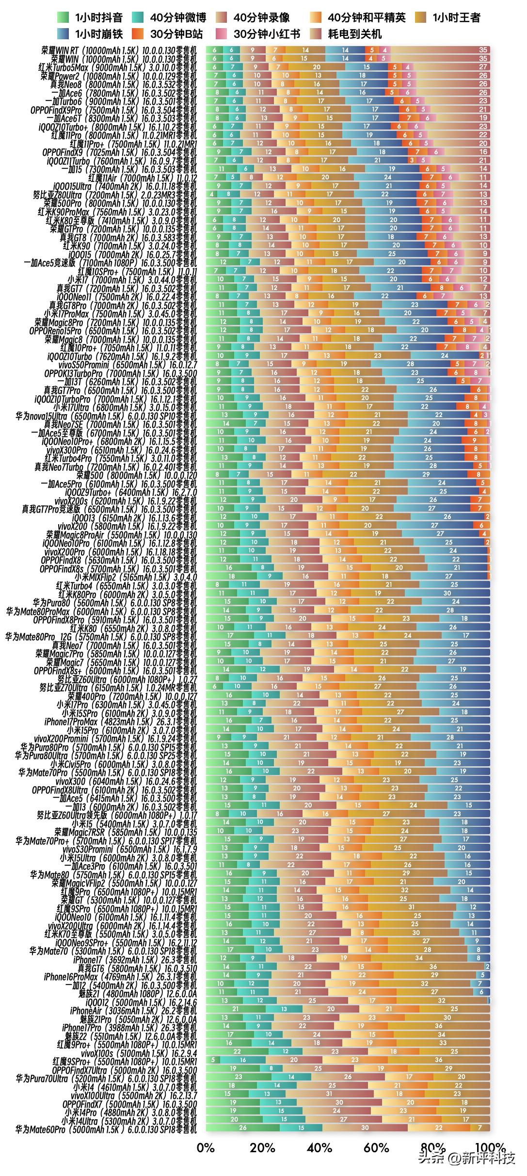 『3月13日最新手机续航榜单』 新评科技续航排行榜 6.0标准续航排行榜复测31台手机续航成绩⭐️完整详细榜单请访问新评科技数据库小程序⭐️ ① 荣耀GTPro零售机 第5次复测 10.0.0.135版本续航时间增加6分钟,总续航时间6小时31分钟,最新排名第22名【对比历史成绩续航缩短】 ② 真我GT8零售机 第5次复测 16.0.3.583版本续航时间增加4分钟,总续航时间6小时29分钟,最新排名第23名【对比历史成绩续航不变】 ③ 一加Ace5竞速版零售机 第5次复测 16.0.3.500版本续航时间缩短3分钟,总续航时间6小时22分钟,最新排名并列第26名【对比历史成绩续航缩短】 ④ 红魔10SPro+零售机 第5次复测 11.0.11版本续航时间增加12分钟,总续航时间6小时22分钟,最新排名并列第26名【对比历史成绩续航不变】 ⑤ 小米17零售机 第5次复测 3.0.44.0版本续航时间增加8分钟,总续航时间6小时19分钟,最新排名第28名【对比历史成绩续航不变】 ⑥ iQOONeo11零售机 第5次复测 16.0.22.4版本续航时间缩短4分钟,总续航时间6小时14分钟,最新排名并列第29名【对比历史成绩续航缩短】 ⑦ 荣耀Magic8零售机 第4次复测 10.0.0.135版本续航时间缩短14分钟,总续航时间6小时09分钟,最新排名并列第33名【对比历史成绩续航缩短】 ⑧ 红魔10Pro+零售机 第3次复测 11.0.11版本续航时间增加1分钟,总续航时间6小时09分钟,最新排名并列第33名【对比历史成绩续航不变】 ⑨ iQOOZ10Turbo零售机 第4次复测 16.1.9.2版本续航时间缩短4分钟,总续航时间6小时04分钟,最新排名第37名【对比历史成绩续航不变】 ⑩ OPPOK13TurboPro 第4次复测 16.0.3.500版本续航时间增加20分钟,总续航时间6小时01分钟,最新排名第39名【对比历史成绩续航增加】 11 真我GT7Pro零售机 第4次复测 16.0.3.500版本续航时间缩短10分钟,总续航时间5小时55分钟,最新排名第41名【对比历史成绩续航缩短】 12 小米17Ultra零售机 第4次复测 3.0.15.0版本续航时间缩短14分钟,总续航时间5小时47分钟,最新排名第43名【对比历史成绩续航缩短】 13 真我Neo7SE零售机 第4次复测 16.0.3.501版本续航时间缩短17分钟,总续航时间5小时46分钟,最新排名第44名【对比历史成绩续航缩短】 14 vivoX300Pro零售机 第4次复测 16.0.24.6版本续航时间缩短22分钟,总续航时间5小时39分钟,最新排名第48名【对比历史成绩续航不变】 15 真我GT7Pro竞速版零售机 第4次复测 16.0.3.500版本续航时间缩短14分钟,总续航时间5小时26分钟,最新排名第55名【对比历史成绩续航缩短】 16 iPhone17ProMax零售机 第3次复测 26.3.1版本续航时间增加3分钟,总续航时间4小时47分钟,最新排名并列第79名【对比历史成绩续航缩短】 17 小米Civi5Pro零售机 第4次复测 3.0.8.0版本续航时间增加2分钟,总续航时间4小时46分钟,最新排名并列第81名【对比历史成绩续航不变】 18 华为Mate70Pro零售机 第5次复测 6.0.0.130 SP18版本续航时间增加12分钟,总续航时间4小时46分钟,最新排名并列第81名【对比历史成绩续航增加】 19 OPPOFindX8Ultra零售机 第4次复测 16.0.3.502版本续航时间缩短1分钟,总续航时间4小时45分钟,最新排名并列第87名【对比历史成绩续航不变】 20 一加Ace5零售机 第4次复测 16.0.3.500版本续航时间增加4分钟,总续航时间4小时42分钟,最新排名第89名【对比历史成绩续航不变】 21 一加13零售机 第4次复测 16.0.3.502版本续航时间不变,总续航时间4小时40分钟,最新排名第90名【对比历史成绩续航不变】 22 努比亚Z60Ultra领先版 第5次复测 1.0.17版本续航时间增加11分钟,总续航时间4小时38分钟,最新排名第91名【对比历史成绩续航不变】 23 小米15零售机 第4次复测 3.0.7.0版本续航时间缩短4分钟,总续航时间4小时36分钟,最新排名第92名【对比历史成绩续航增加】 24 vivoS30Promini 第5次复测 16.1.7.9版本续航时间缩短5分钟,总续航时间4小时34分钟,最新排名第95名【对比历史成绩续航缩短】 25 小米15Ultra零售机 第5次复测