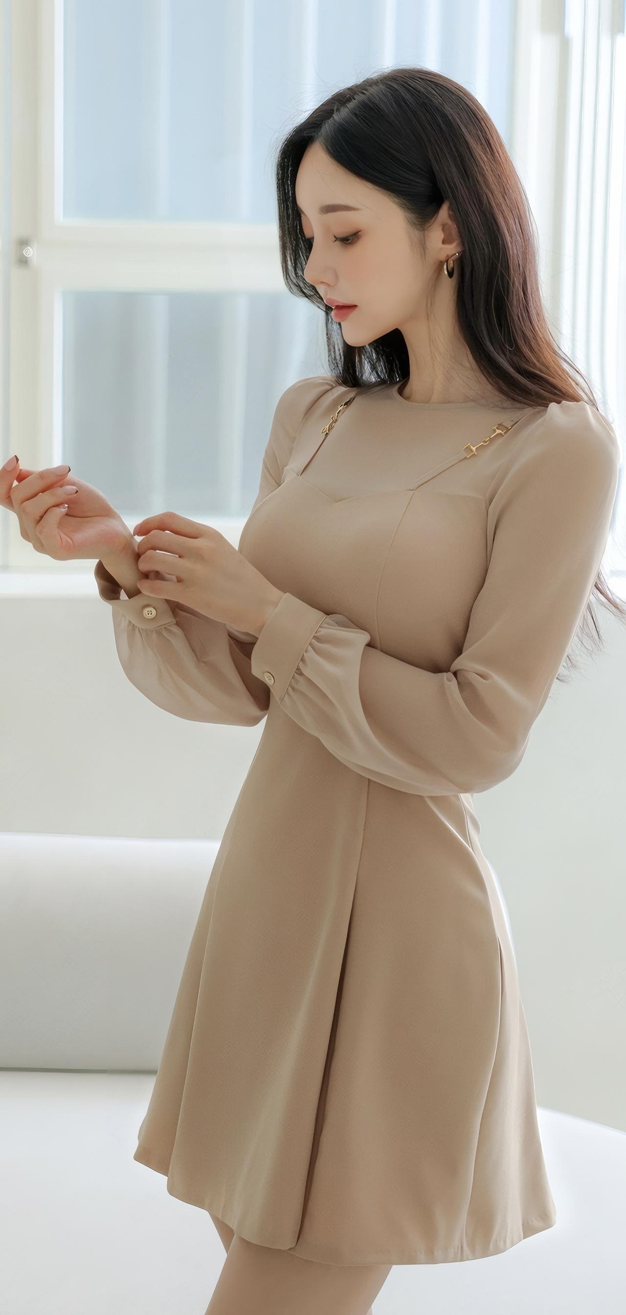这位小姐姐穿着米色连衣裙,优雅自然。
