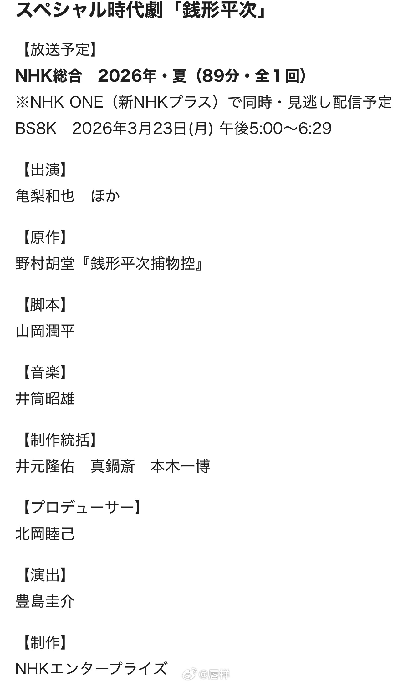 演员龟梨和也主演的特别时代剧『钱形平次』确定将于2026年夏季在NHK综合频道播出。这部曾通过电影、电视剧被大众长期喜爱的经典时代剧,将在令和时代全新翻拍。故事以江户为舞台,讲述被称为“捕盗天才”的町捕钱形平次的活跃表现。