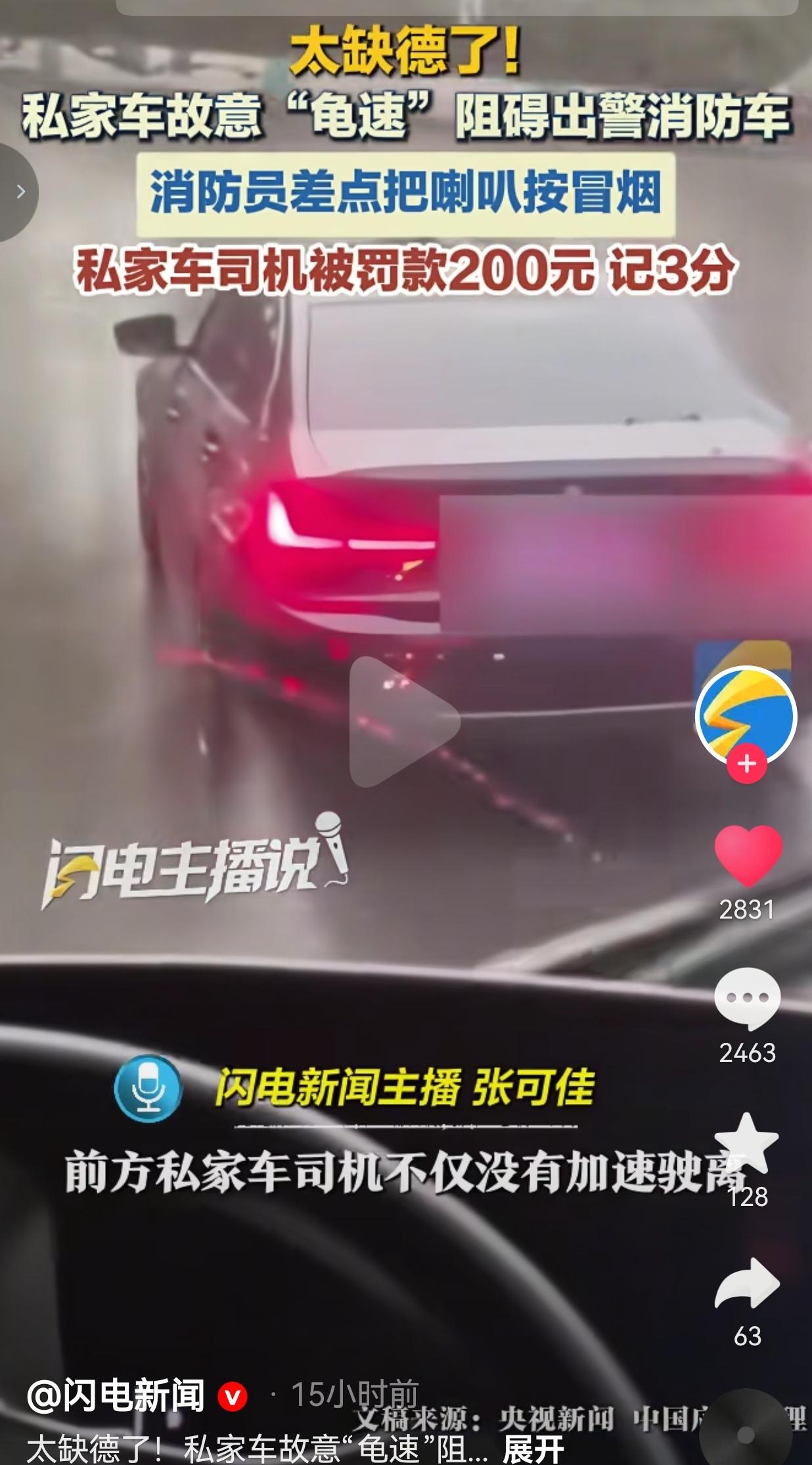 太缺德!最后害人害己了吧?私家车故意龟速挡消防车,消防车狂按喇叭到冒烟都不让,最后的结局也是大快人心:罚200并记3分。 广东梅州,一辆消防车正拉着警笛往火场赶,路上明明空荡荡,却被一辆黑色私家车死死堵在后面。 消防员一遍一遍鸣笛、喊话,让他靠边让行,可这司机倒好,不仅不加速,反而像按了放慢键似的,在马路上“龟速”蠕动,把通畅的路开出了堵车的效果,喇叭都快被按冒烟了,他就是纹丝不动。 最后,这位“任性”的司机被依法罚款200元,记3分。 网友看到后评论说:“真的看怒了!空路都不让,这司机是心瞎了还是眼瞎了?消防车是救命的,不是给你斗气玩的!” 也有的网友说自己的经历:“我每次听到警报声,不管红灯绿灯,第一时间靠边让行,这是做人的底线!罚200扣3分真的太轻,就该拘留!” 还有的网友说:“万一火场里是他爹妈妻儿,他还敢这么慢悠悠挡着吗?人心都是肉长的,怎么就这么冷血!” 看到这视频的时候,我气得牙都痒了。这哪里是开车,这是在拿别人的命开玩笑啊! 消防车出警,每一秒都关乎着生死——可能是被困在火海里的老人孩子,可能是刚被救出的伤员,可能是还在燃烧的民房。 你多堵一秒,别人就多一分危险,这不是路怒,这是在跟死神抢时间! 我们总说“让行特种车辆”,可偏偏有人把这当成耳旁风,甚至故意较劲。你觉得自己只是“开慢了点”,可你堵的是别人生的希望,是消防员拼尽全力的奔赴。 有人说“罚200记3分太轻了”,我也觉得。这种漠视生命的行为,不该只是简单的扣分罚款,更该让他好好想想:如果被堵的是去救他家人的救护车,他还能这么淡定地“龟速”吗? 这让我想起之前那些给救护车、消防车让行的司机们——有人主动压线让道,有人宁愿闯红灯也要腾出生命通道,他们用自己的行动告诉我们:什么叫“敬畏生命”。 可偏偏就有这种人,把公共道路当成自己的私人地盘,把别人的紧急求助当成耳边风,自私到了骨子里。 对此,你怎么看?