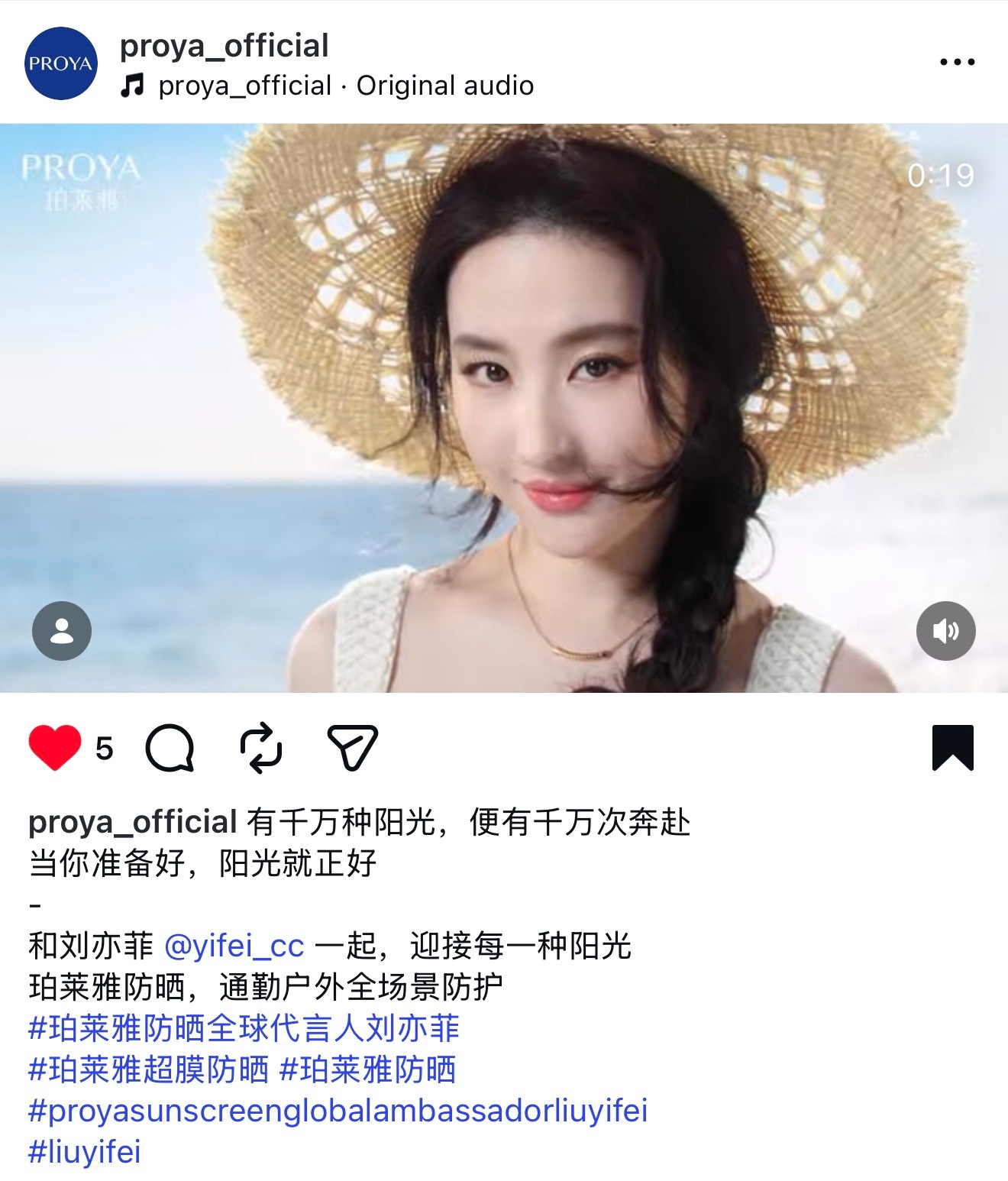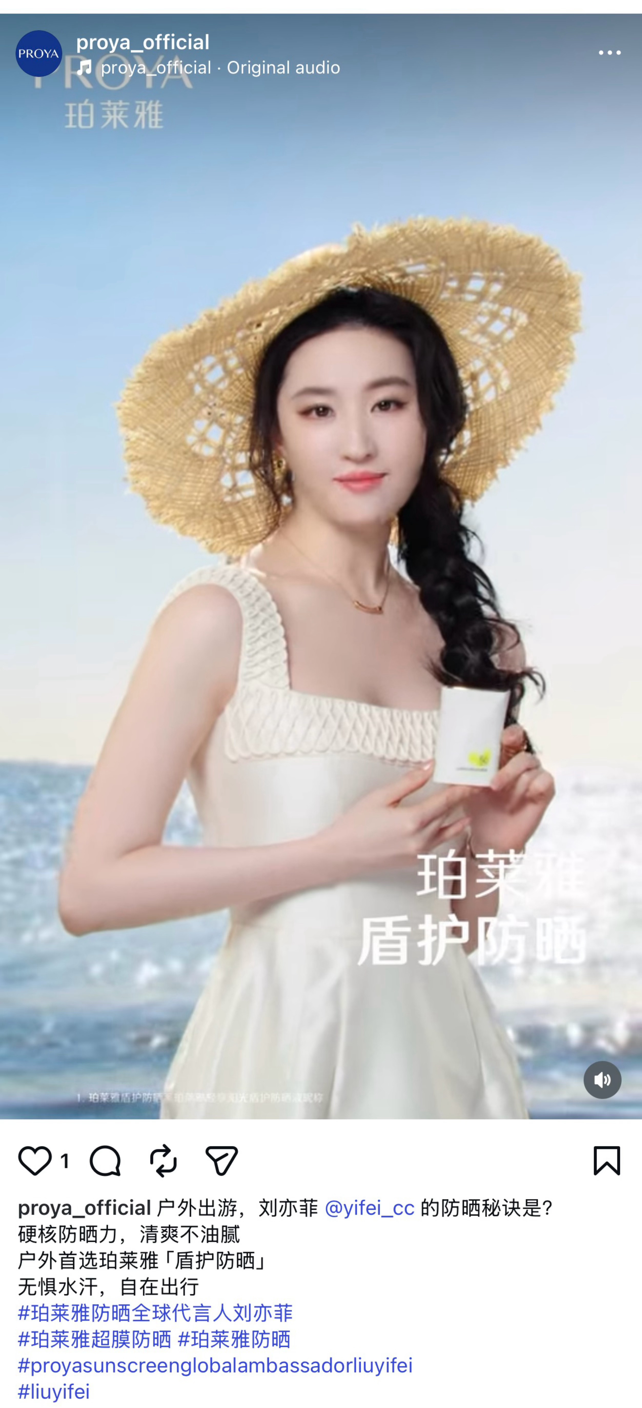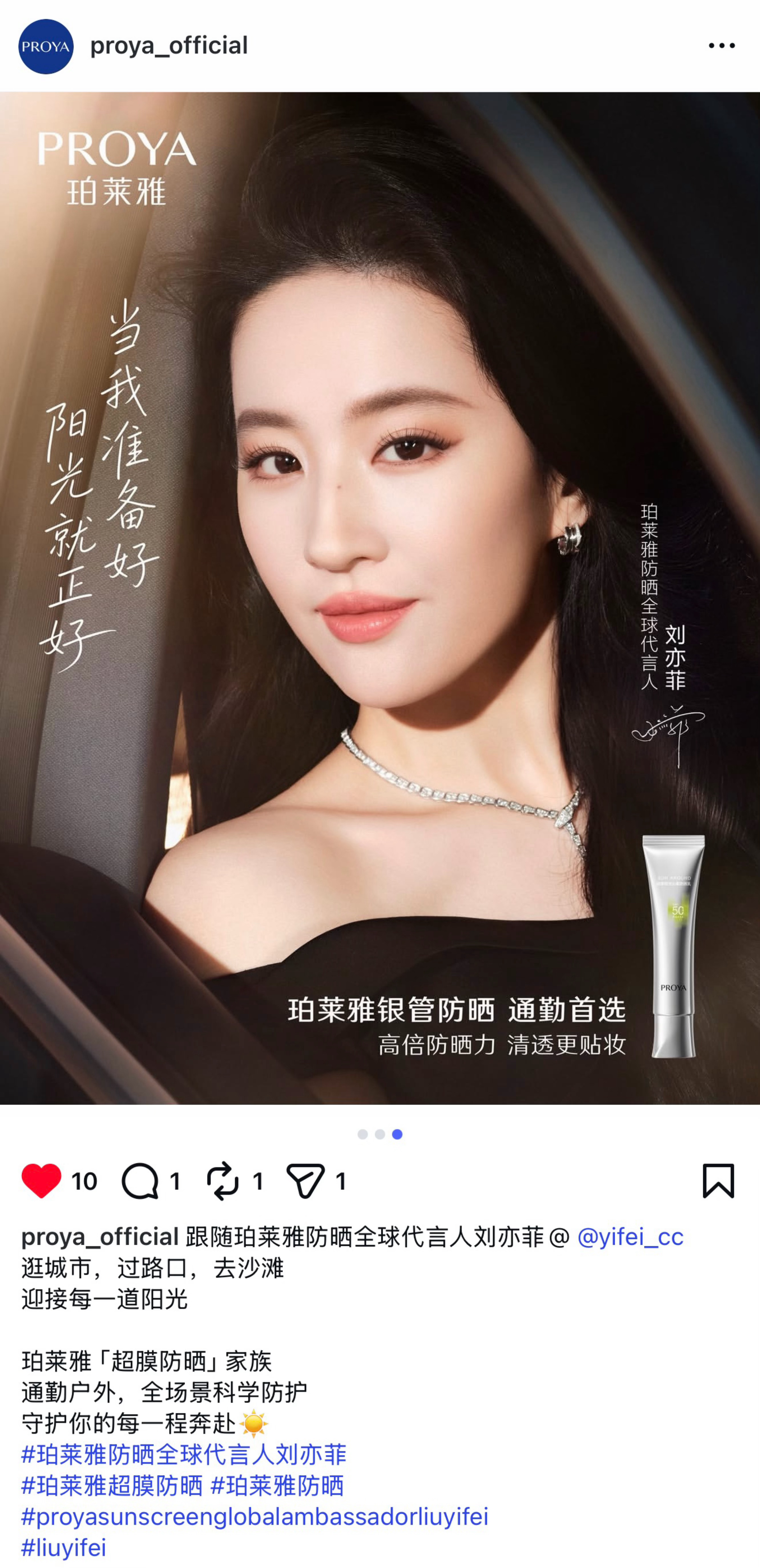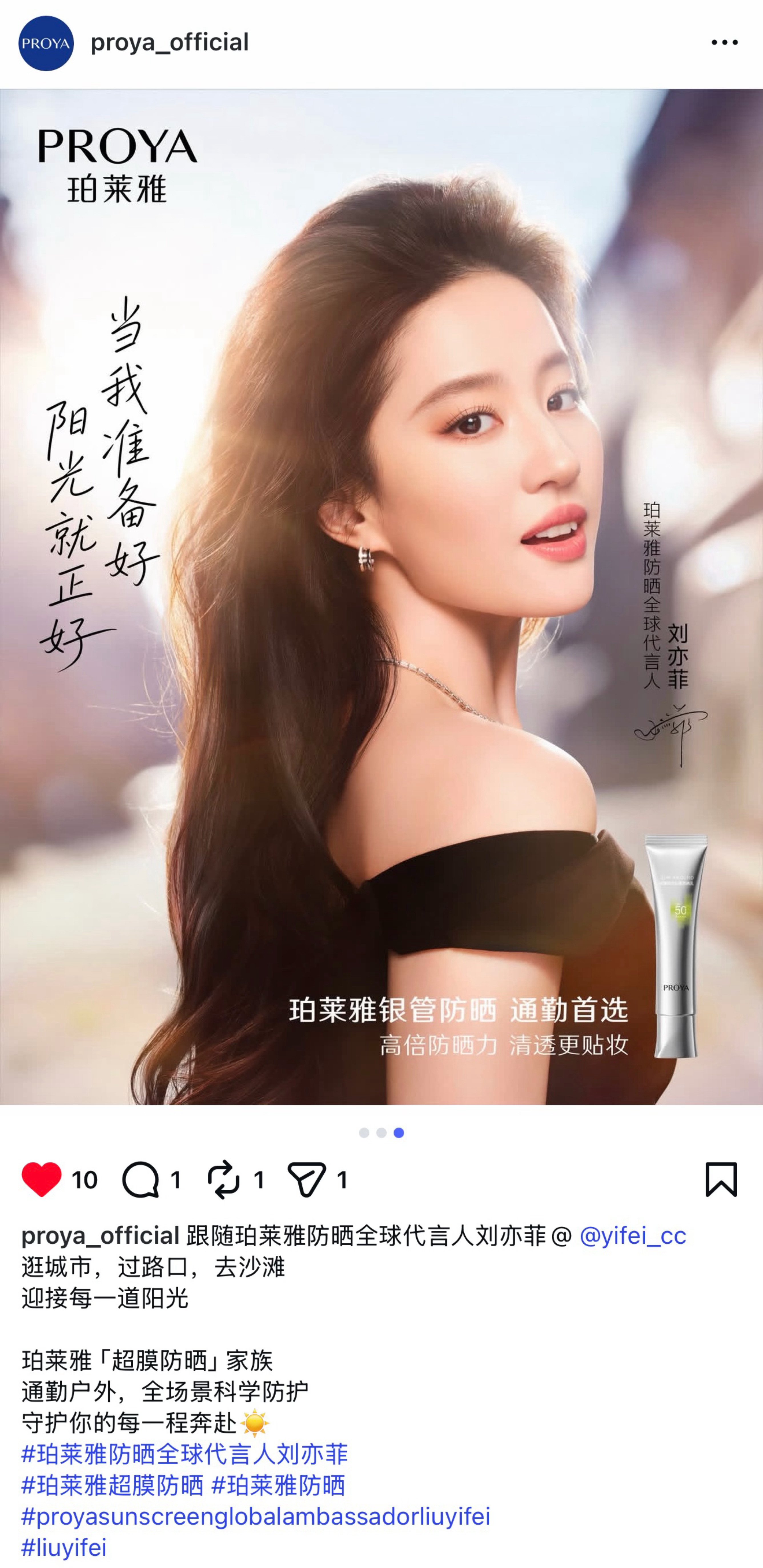 刘亦菲 珀莱雅Proya官方Ins发布代言人刘亦菲最新防晒广告超美超绝珀莱雅防晒全球代言人刘亦菲