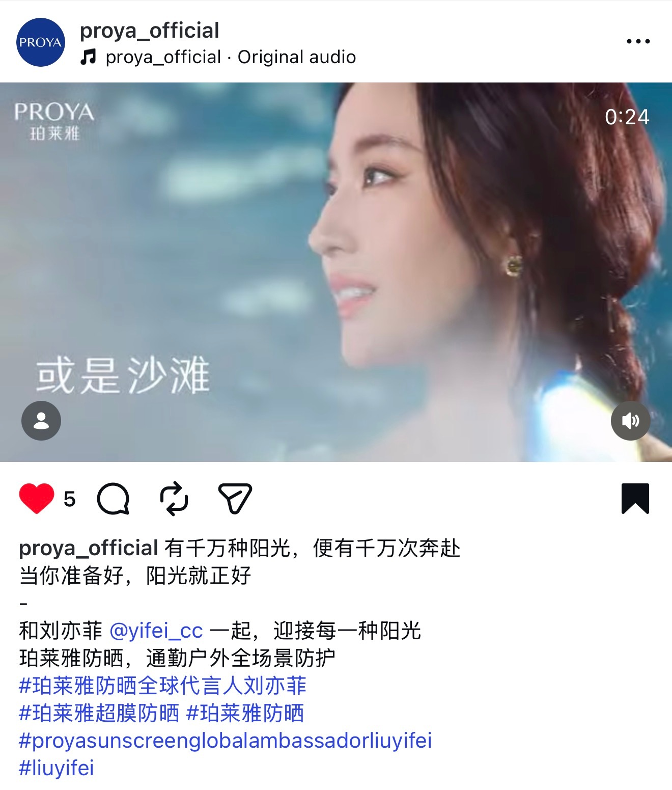 刘亦菲 珀莱雅Proya官方Ins发布代言人刘亦菲最新防晒广告超美超绝珀莱雅防晒