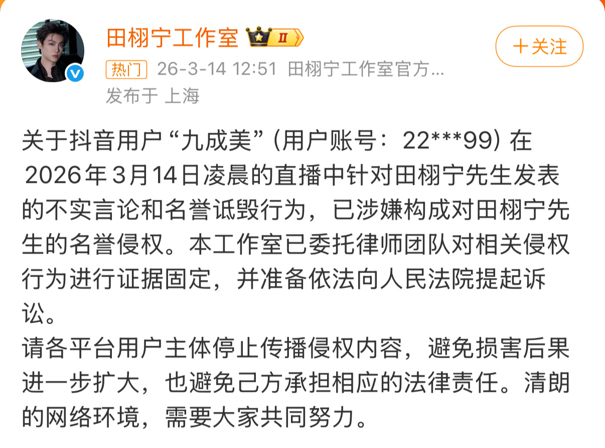 九成美 你要告我吗不告你告谁?工作室反应这么快,肯定相信田栩宁。