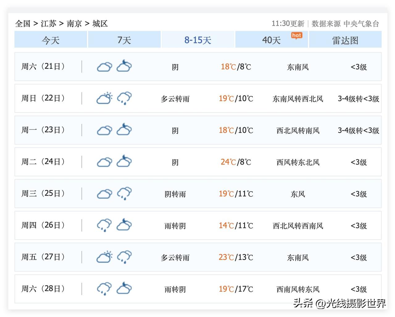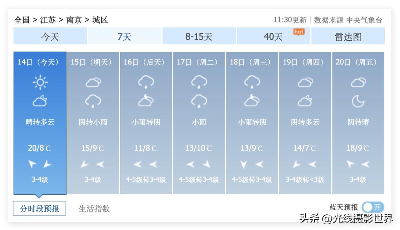 江苏省南京市,即将迎来强冷空气速冻!虽然3月14日星期六的南京市有太阳,最高气温20度……但是,明天,3月15日,星期天,南京阴转小雨……3月16日,星期一,南京小雨转阴,气温暴跌至8-11度……湿冷湿冷的,南京的小伙伴们,又要穿回羽绒服和秋衣秋裤啦! 2026年春天,长江流域的赏花高潮,这周末可能就基本结束了……贵州省贵阳市平坝农场的樱花,下周就不值得外省市游客去观赏呢…… 这几天,北京,南京,杭州,桃花也开了,西湖白堤的桃红柳绿……可是,未来几天,长三角,降雨降温…… 中央气象台的最新天气预报……对于计划3月20日到30日去赏花的人来说……确实是措手不及! 是的,去年前年,传统来说,3月20日到30日是春季赏花的高潮……哎! 当然,3月20日到30日,还是有春天的,还是适合本地人去欣赏的……只是,对于需要耗费机票高铁票和住宿费的人来说……可能就不那么适合了…… 长江流域……2026年春天,来的太早……
