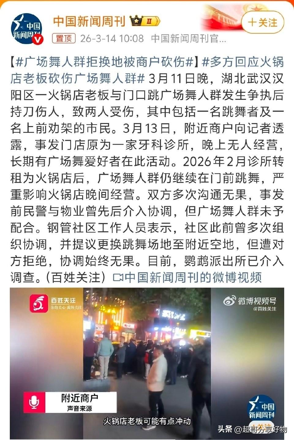 事件暴露出城市公共空间治理的深层裂痕。3月11日晚,湖北武汉汉阳区一家火锅店与门前广场舞人群因场地噪音爆发冲突,店主持刀伤人致两人受伤,一场邻里摩擦演变为双输悲剧,背后是长期协调失效与规则真空的叠加。 矛盾根源在于公共空间使用的错位与博弈。事发地原是夜间闲置的牙科诊所,多年来成为广场舞固定场地;转租为火锅店后,营业需求与居民活动习惯直接碰撞。社区曾协调更换至附近空地,却遭以“习惯”“风水好”为由拒绝,民警介入也因未达肢体冲突标准难以立案,导致矛盾持续升级。店主称生意受严重影响,月损失超四万,而广场舞群体认为长期使用权受挑战,双方各执一词。 法律边界与现实困境的失衡是悲剧催化剂。现行法规对噪音污染处罚仅200元,难以震慑89分贝的超标噪音;店主维权渠道不畅,最终选择极端方式,越过法律红线。伤人行为必然面临法律制裁,但事件背后的治理短板更需警惕。 基层治理需补齐制度短板。社区应建立分时段、分区域的公共活动指引,明确噪音标准与场地使用规则;平台需畅通维权通道,联动城管、公安形成合力,避免矛盾从摩擦升级为暴力。同时,双方需理性让步,尊重彼此合法权益,让公共空间回归和谐共享。 武汉火锅店冲突 公共空间治理 邻里矛盾化解 基层治理缺位