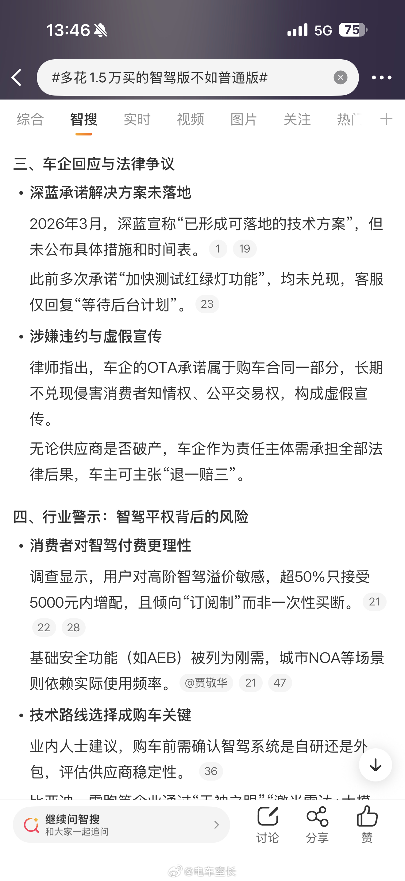 多花1.5万买的智驾版不如普通版315车主维权的各类话题都出来了,今天是重庆某车企的智驾版体验不如普通版,这个事情也很简单就是因为“高阶版”的供应商暴雷,背后的原因就是因为部分车企早期的辅助驾驶研发延迟,又为了抢节奏不得不找供应商外包。所以要在核心领域做到领先,真的是得投入研发团队,要么就早点和优秀的外部企业提前研发,打补丁真的迟早会出问题。对于用户来说,多数人对如何选“好车”,怎么样是好用的辅助驾驶和稳定的企业这个事是没有那么强的感知的。所以车评人内容不能全看,但还真的不能不看。