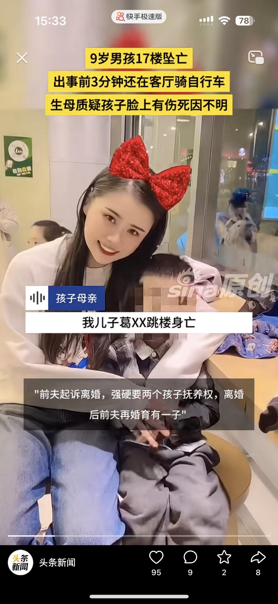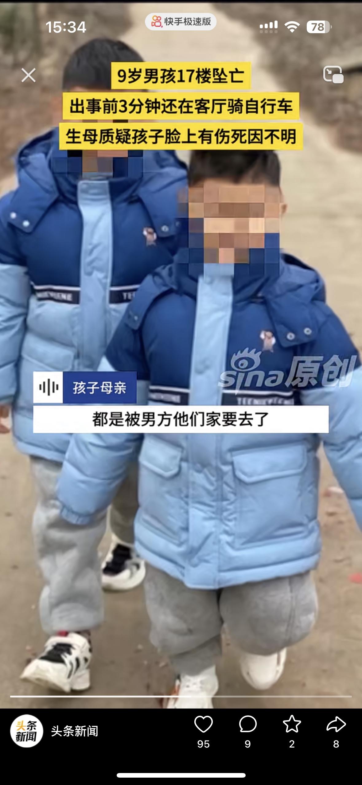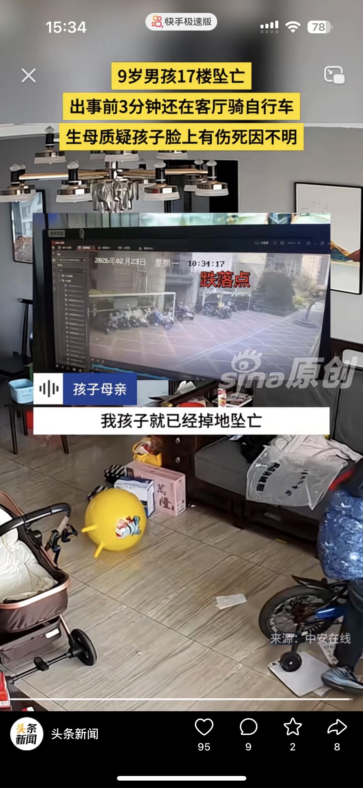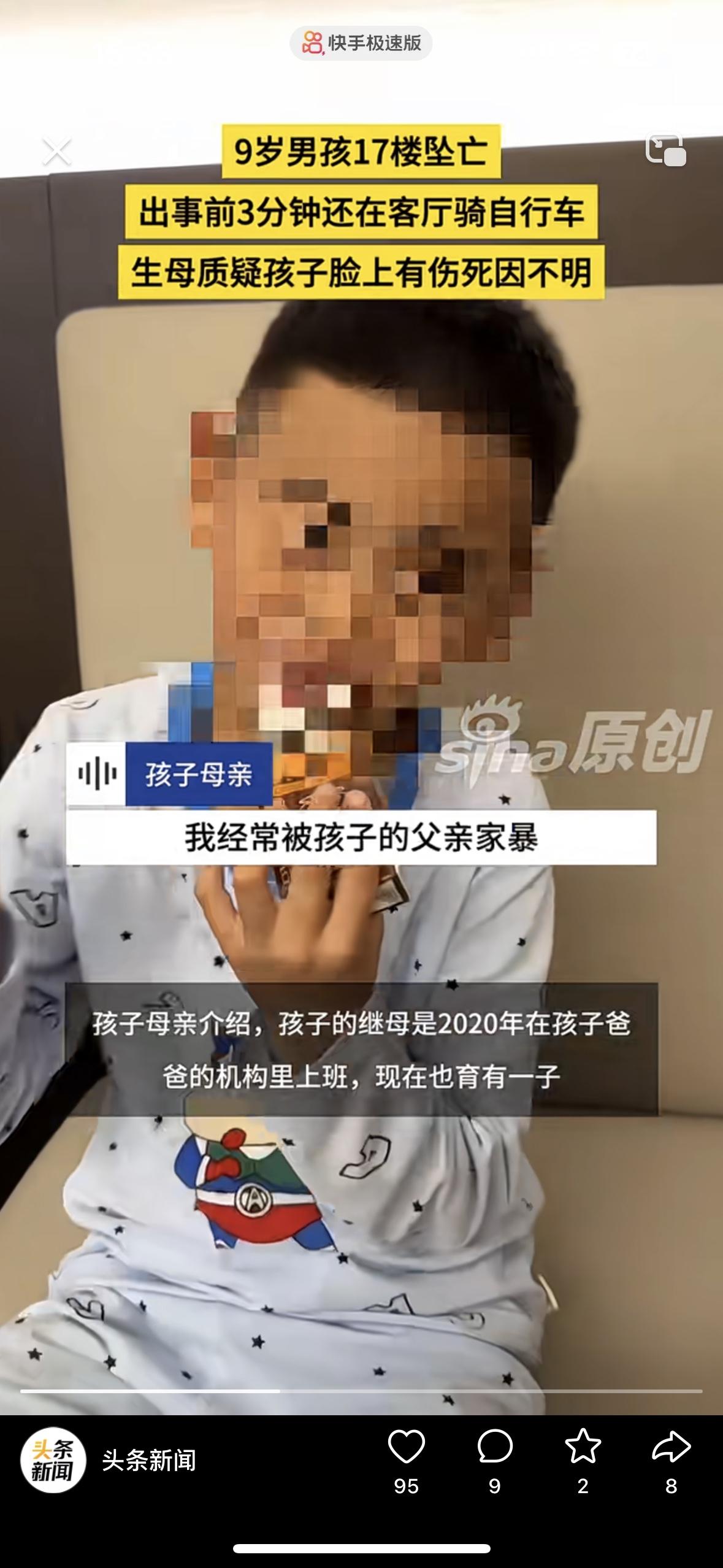 太让人心疼了!3分钟前还在骑车欢乐,9岁的孩子突然坠亡 妈妈说这绝对不是意外,我儿子的脸上有伤。孩子从17楼坠落,谁看了都心如刀绞。 监控拍的清清楚楚,孩子出事前还在玩没有任何的异常,却在老二跟奶奶玩的时候,儿子坠楼了 女子说她跟老公离婚是老公愿意的,买的房子是她的父母掏的钱。她不想离婚为了孩子,老公却坚持离婚还转移了财产! 现在老公2婚,二婚妻子跟她前夫在一起上班,还有个儿子!老公坚持把和女子的两个孩子要过去,却发生了这样的事!儿子的脸上有伤,她觉得不止是坠楼这么简单……大家怎么看待呢?