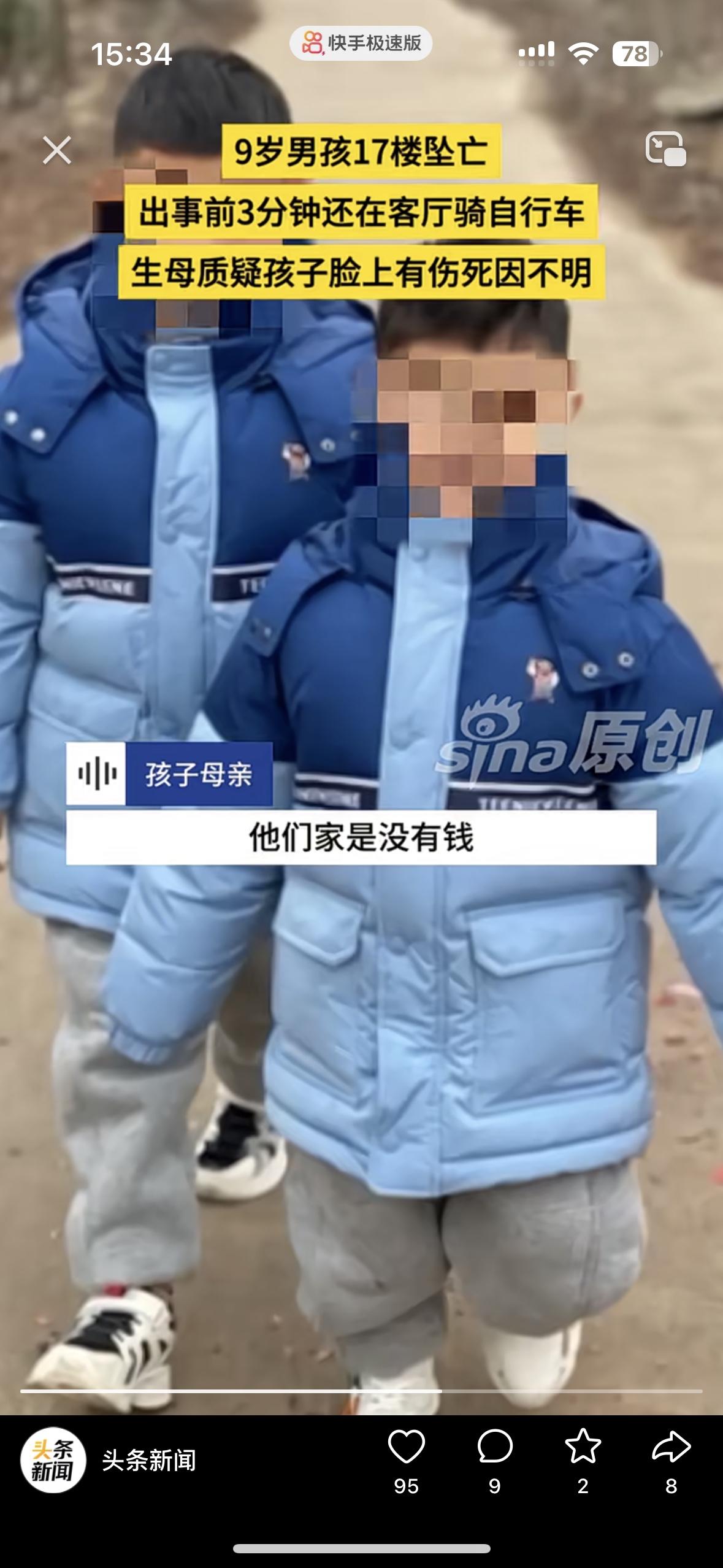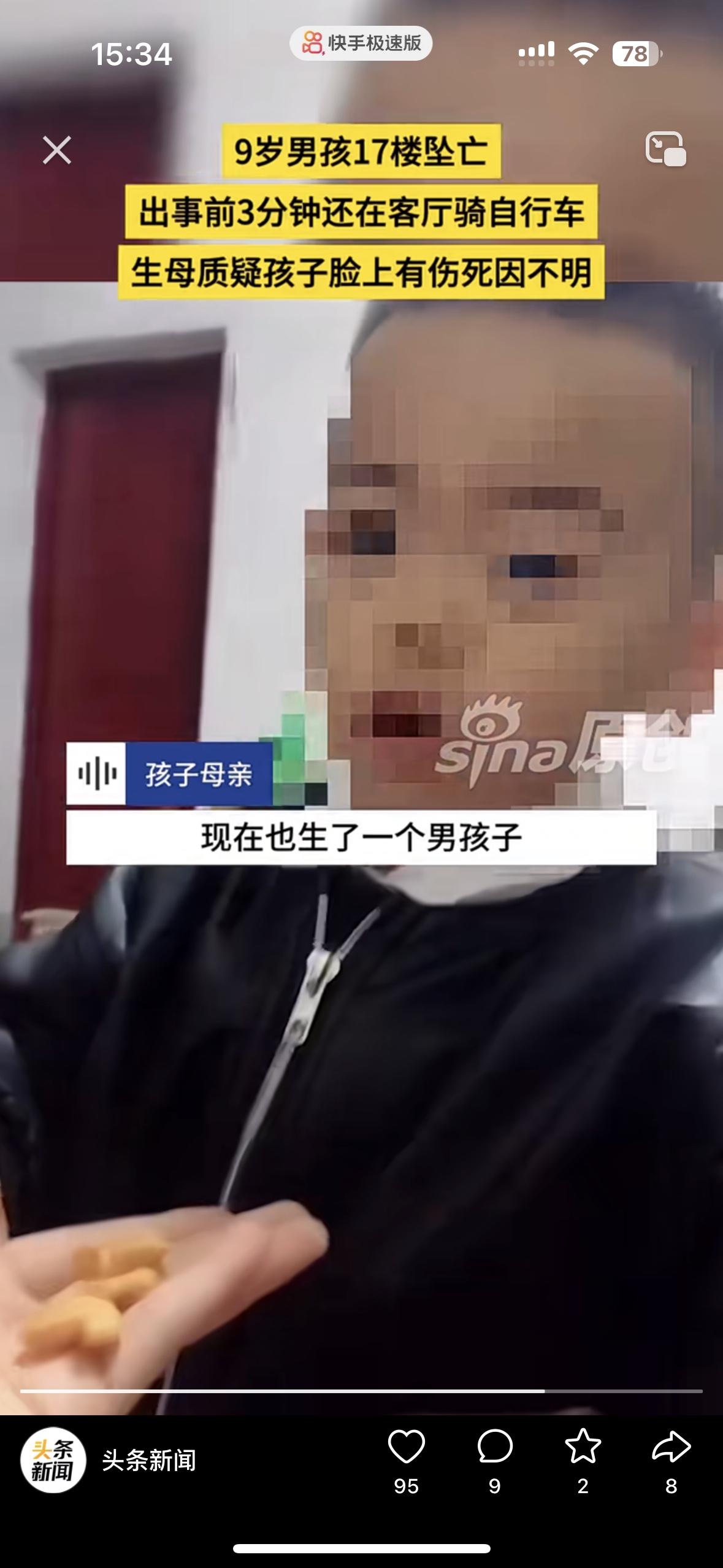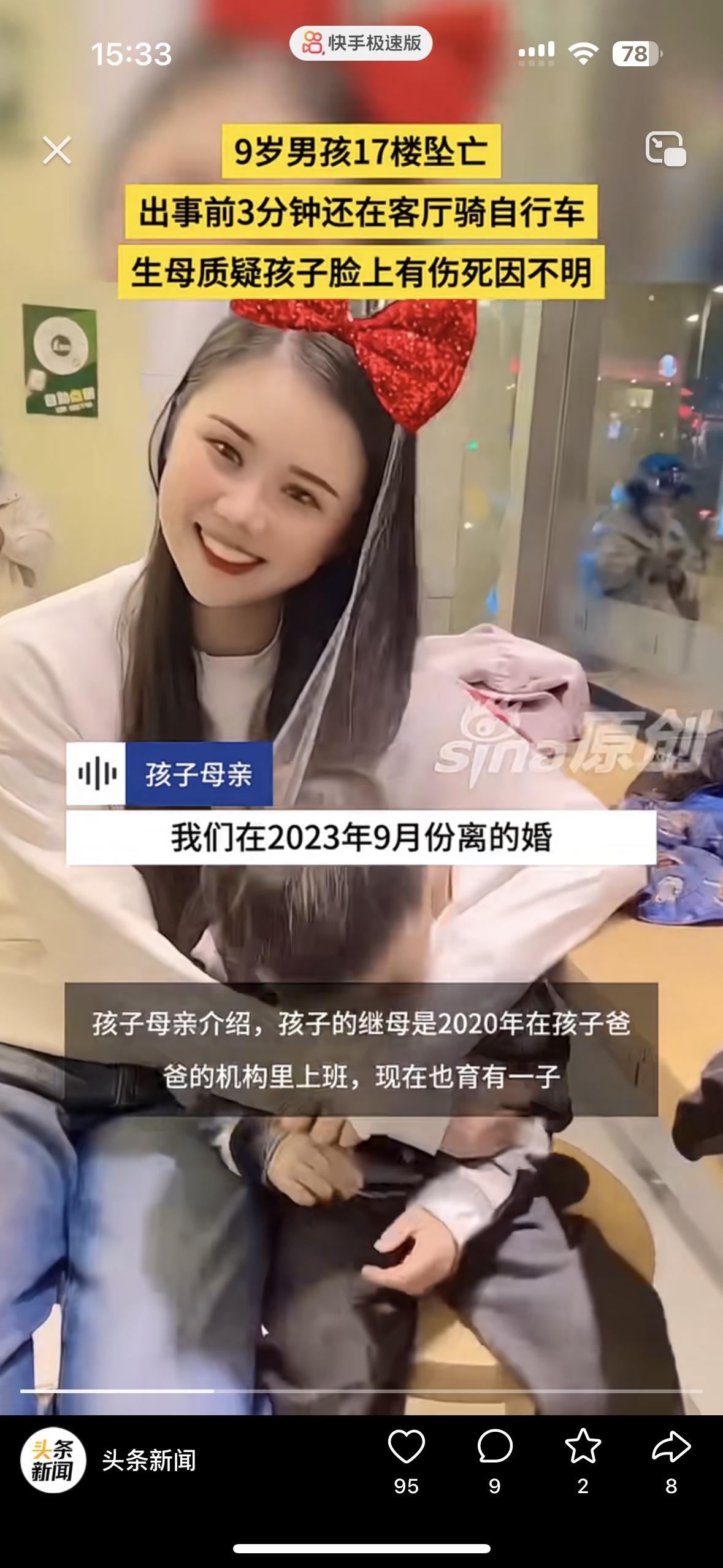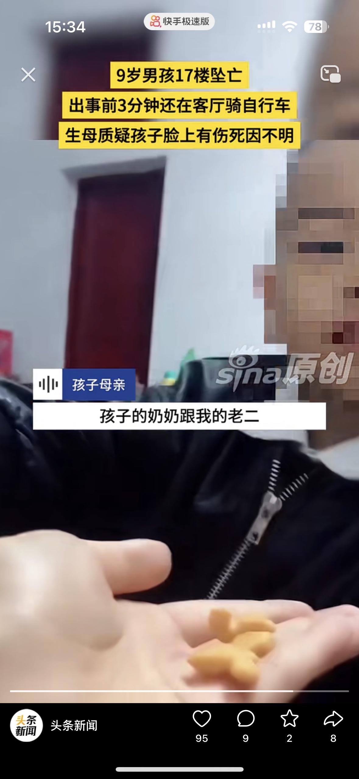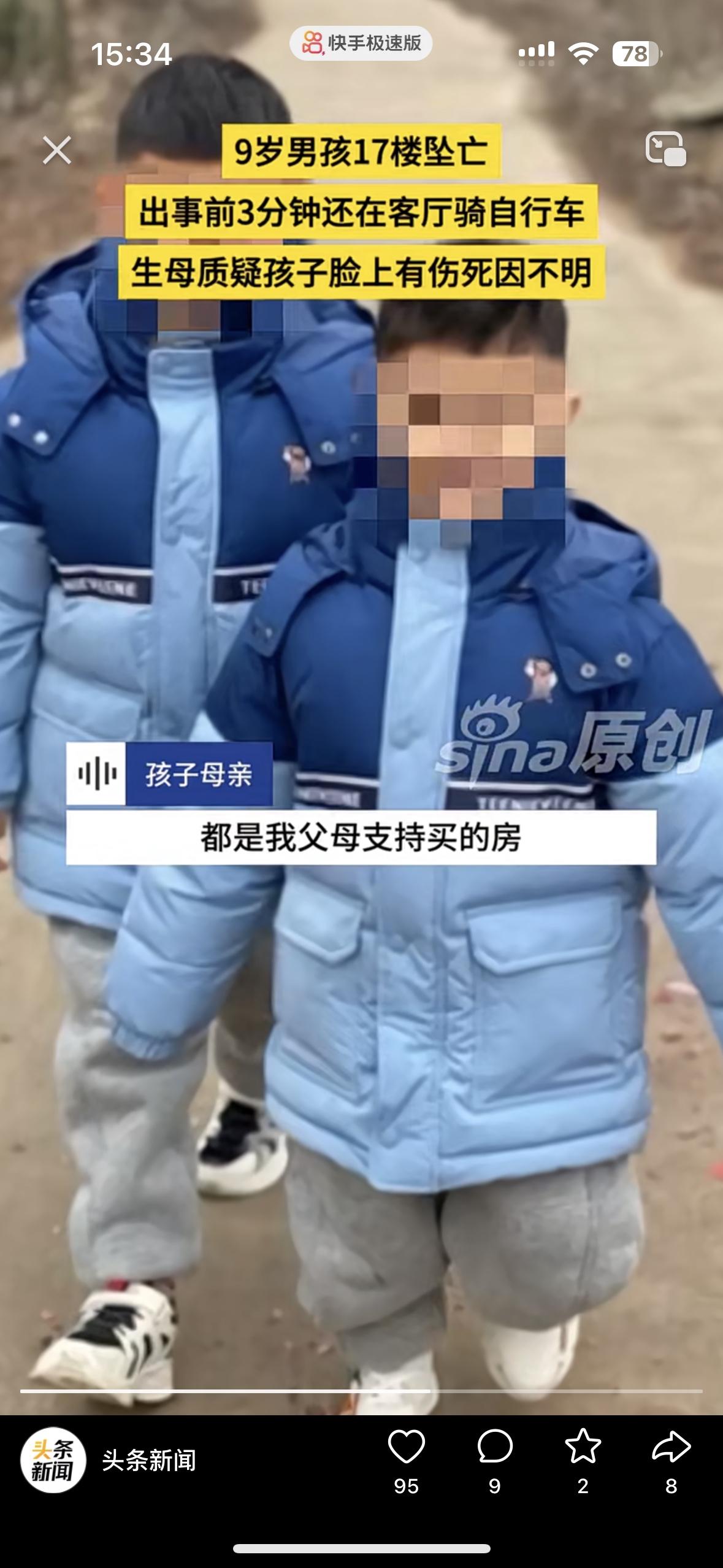 太让人心疼了!3分钟前还在骑车欢乐,9岁的孩子突然坠亡 妈妈说这绝对不是意外,我儿子的脸上有伤。孩子从17楼坠落,谁看了都心如刀绞。 监控拍的清清楚楚,孩子出事前还在玩没有任何的异常,却在老二跟奶奶玩的时候,儿子坠楼了 女子说她跟老公离婚是老公愿意的,买的房子是她的父母掏的钱。她不想离婚为了孩子,老公却坚持离婚还转移了财产! 现在老公2婚,二婚妻子跟她前夫在一起上班,还有个儿子!老公坚持把和女子的两个孩子要过去,却发生了这样的事!儿子的脸上有伤,她觉得不止是坠楼这么简单……大家怎么看待呢?