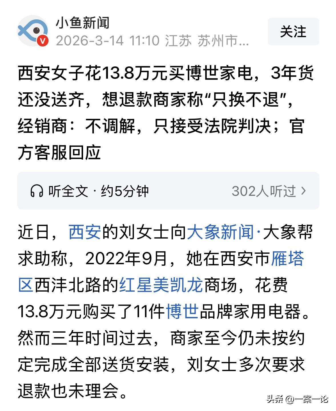 “离大谱了!”陕西西安,女子逛商场时,看上了某品牌的11件家用电器,工作人员说家电全部都是进口货,必须付全款才能预定,女子便付了13.8万的全款,没想到等了3年,商家依然没有把货送齐,女子要求退款,商家表示只换不退。女子没招了,只好找相关部门主持公道,却被不予立案,原因让她觉得太离谱了! 刘女士这两年为了那十几万的家电款,真是把心都操碎了。 事情得从2022年9月说起。她逛商场时看上了某品牌的11件电器。 本来商场规矩是只付两成定金,但卖家那张嘴太能说,非讲这批货全是“原装进口”,得付全款才能锁定货源。 刘女士虽然心里觉得奇怪,为了省事儿,还是把13.8万一股脑转了过去。 单子上写着,将在2022年12月22号送货上门。 可到了日子,刘女士左盼右盼只来了一个蒸汽烤箱。 商家解释,因为特殊时期封关,进口货卡路上了。 刘女士忍了,可再一细瞅商家给的单子,鼻子都气歪了!好几样订好的进口型号,神不知鬼不觉变成了国产货。 更离谱的是,因为没提前上门量尺寸,家里留的空儿根本塞不进这些电器。 到了2024年1月,新单子发来了,抽油烟机还是国产的。 刘女士还没来得及发火,4月份更魔幻的事发生了。售后突然上门,说之前送的那台蒸汽烤箱“流程不对”,硬生生给搬回去了! 刘女士彻底急了,这不就是拿钱不办事吗?2025年,她跑断了腿,先找西安市消协。 消协把两边拉到一起谈,结果商家比她还横,说要换货行,退钱没门,有本事你去法院告我! 转头她又去求相关部门主持公道,结果等来一纸“不予立案通知书”。 理由让人哭笑不得:说她举报虚假宣传是2022年9月22号之前的事,过后没再犯,所以不归他们管。 这一盆盆冷水泼下来,刘女士心都凉了半截。直到2026年2月,终于有了点动静。 品牌官方客服打来电话,说是厂家出面协调了,经销商给出个方案,那就是把刘女士那13.8万的旧单,免费升级成总价17万多的最新款,还白送一台除湿机。 这听着像是天上掉馅饼,刘女士却不敢接。 她跟记者吐槽,到现在连个经销商的电话都没接到,谁知道是不是缓兵之计?再说那新清单里,保不齐还有不是进口的水货,标价17万指不定是虚高抬价。 她现在只有一个诉求:把我的13.8万退回来,这烂摊子我不收拾了! 可钱在人家口袋里,想拿回来,真是难呀! 《消费者权益保护法》第16条第1款、第3款规定:经营者向消费者提供商品或者服务,应当依照本法和其他有关法律、法规的规定履行义务……经营者向消费者提供商品或者服务,应当恪守社会公德,诚信经营,保障消费者的合法权益;不得设定不公平、不合理的交易条件,不得强制交易。 经销商收取全款后长期不发货、擅自将“进口”换为“国产”,严重违反诚信原则和法定履约义务。 相关部门以“无连续状态”为由不予立案存在适用法律瑕疵,因商家违约状态持续至今。 这个法条强制经营者守信,是刘女士维权的核心依据,商家行为不仅构成违约,更涉嫌欺诈,理应承担退赔责任。 对于这件事,你怎么看? 欢迎关注@一案一论
