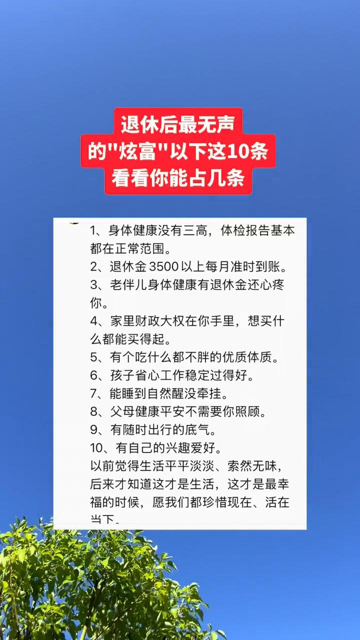 退休后最无声的"炫富",以下这10条看看你能占几条? ·1、身体健康没有三高,体检报告基本都在正常范围。 ·2、退休金3500以上每月准时到账。 ·3、老伴儿身体健康有退休金还心疼你。 ·4、家里财政大权在你手里,想买什么都能买得起。 ·5、有个吃什么都不胖的优质体质。 ·6、孩子省心工作稳定过得好。 ·7、能睡到自然醒没牵挂。 ·8、父母健康平安不需要你照顾。 ·9、有随时出行的底气。 ·10、有自己的兴趣爱好。 以前觉得生活平平淡淡、索然无味,后来才知道这才是生活,这才是最幸福的时候,愿我们都珍惜现在、活在当下。