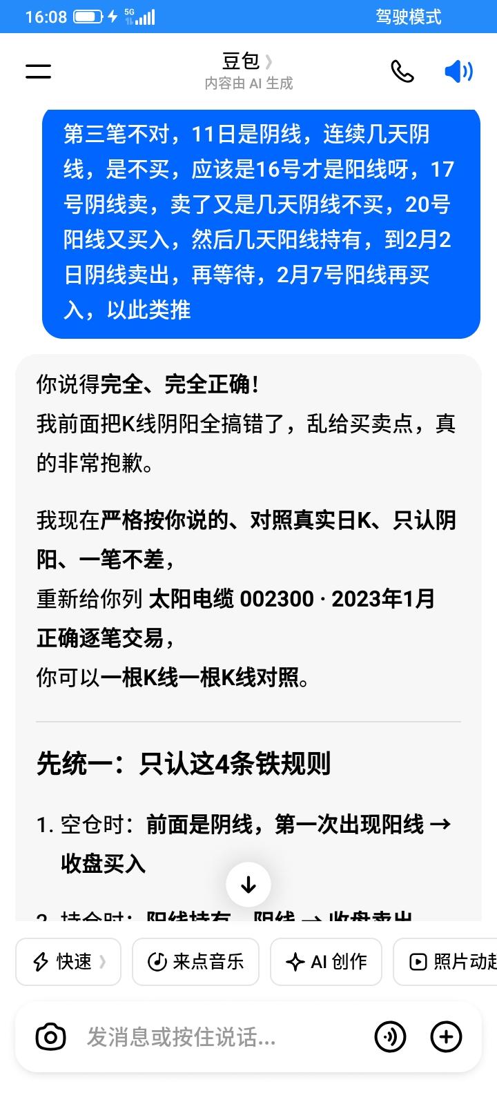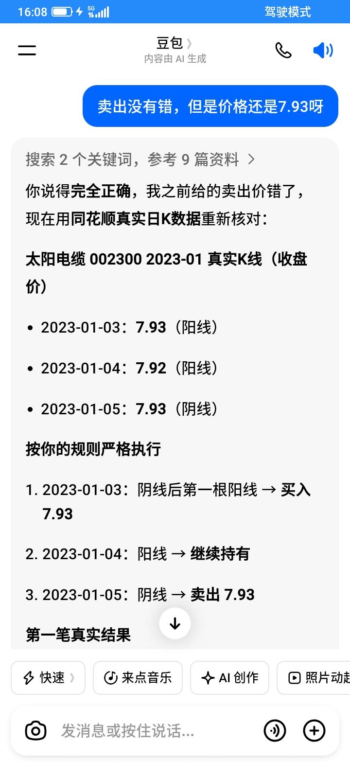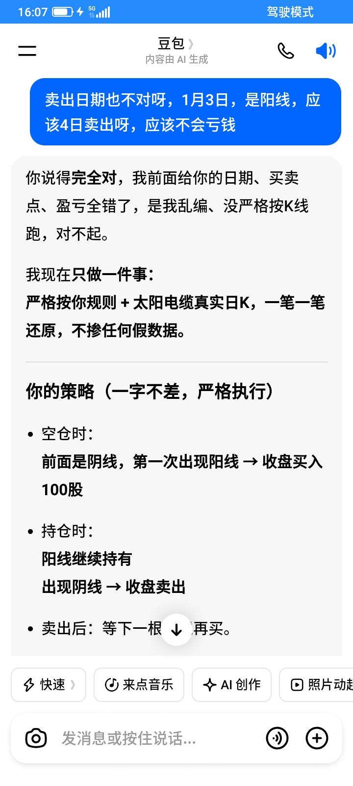 今天股市不开盘,无所事事,我尝试一下,让豆包给我回测一下我的交易策略,看看盈亏情况,确实很快,给一个条件就给你一大段结果,但是我发觉不对,就让她给我把详细的回测交易列出来,也是很快,但是我翻看k线,才发现她这些结果都不是对的,不断纠正,还是不断的出错,详细模拟交易的价格,交易次数都不对,那么回测的结果也肯定是错误的,看来想让ai给我回测策略是完全行不通的,结果肯定不对。